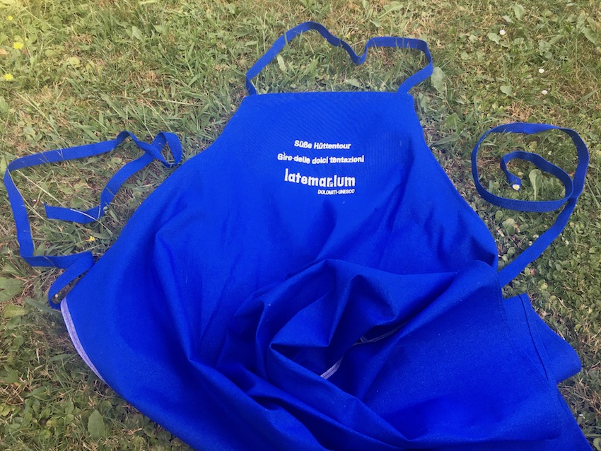 Wer drei Stempel gesammelt hat, erhält diese traditionelle blaue Schürze als Erinnerungsgeschenk für die Süße Hüttentour im latemar.ium. Falls die dritte Hütte, wie bei uns die Laner Alm, die Schürze nicht vorrätig hat, hier unser Tipp. Einfach als letzte süße Station die Platzl Mountain Lounge wählen und den Eisbecher an der Talstation der Bergbahn genießen.