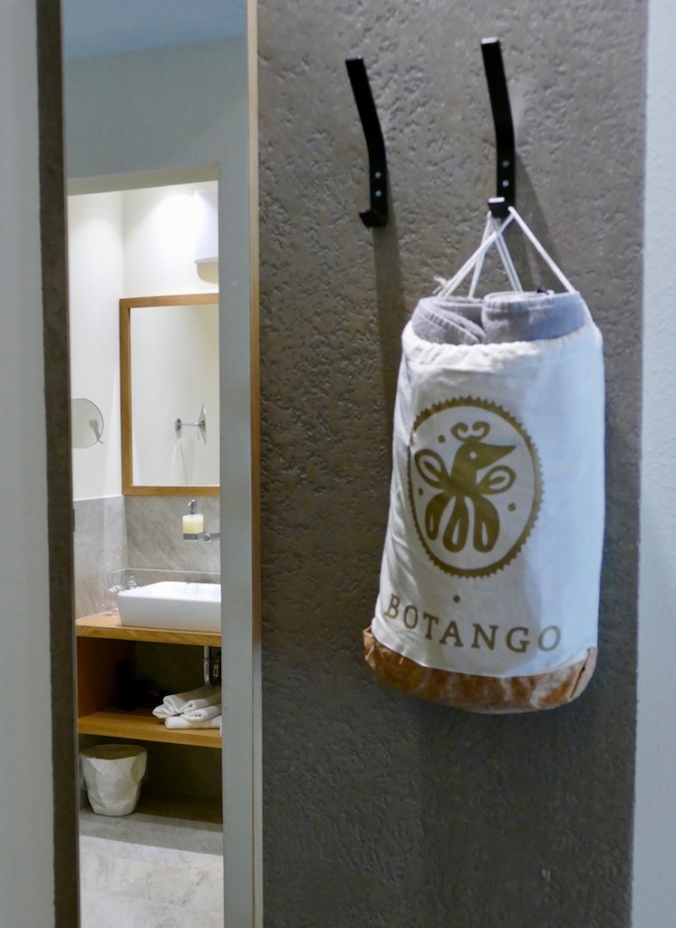 Auch der gepackte BOTANGO-Beutel mit Badehandtüchern und FlipFlops hängt schon bereit, ebenso wie die kuscheligen Bademäntel und animiert den Wellness-Bereich zu erkunden.