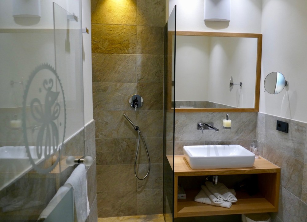 Highlights für uns die Kaffeemaschine im Zimmer (nachhaltig mit Pads und nicht mit Alukapseln!) für den ersten Kaffee am Morgen im Bett, der Holzfußboden, die begehbare Regenwalddusche und die Sitzecke mit Arbeitsbereich am Fenster, Highspeed-WLAN natürlich inklusive.