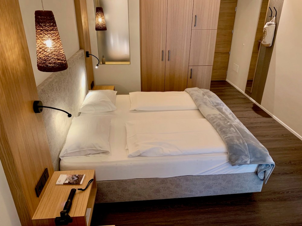 Unser Zimmer war bereits für uns fertig. Gefreut hätten wir uns über einen kleinen Begrüßungsdrink. Perfekt passen würde hier z.B. ein Getränk mit Äpfeln, denn im und um den ganzen Ort herum wird nicht Wein, sondern werden hauptsächlich Äpfel angebaut.