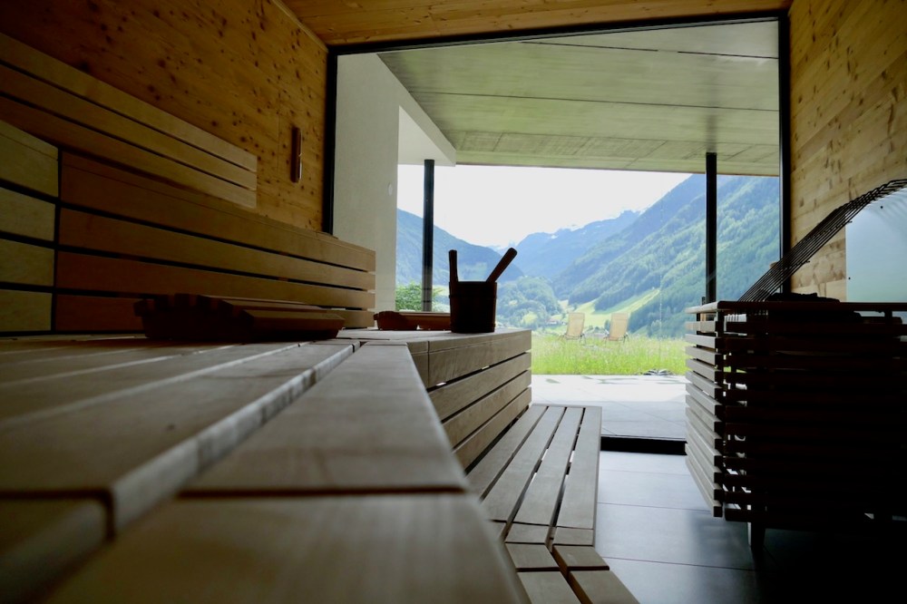 Wohltuende Heubetten, chillige Hängesessel und der Blick raus in die Natur über das ganze Tal, sowohl vom Relaxbereich aus, als auch von der Panoramasauna nebenan.