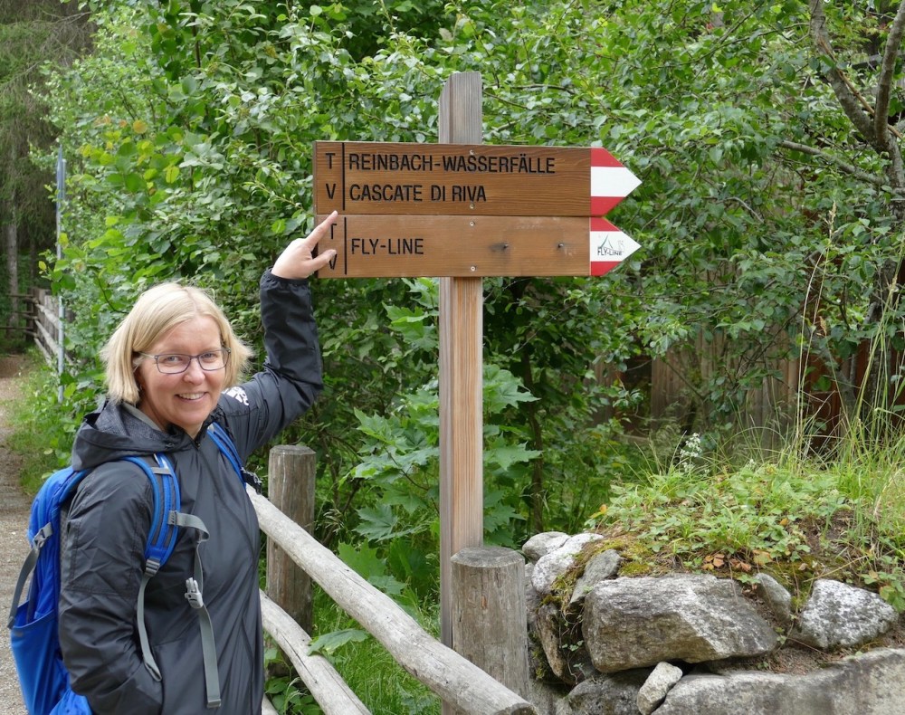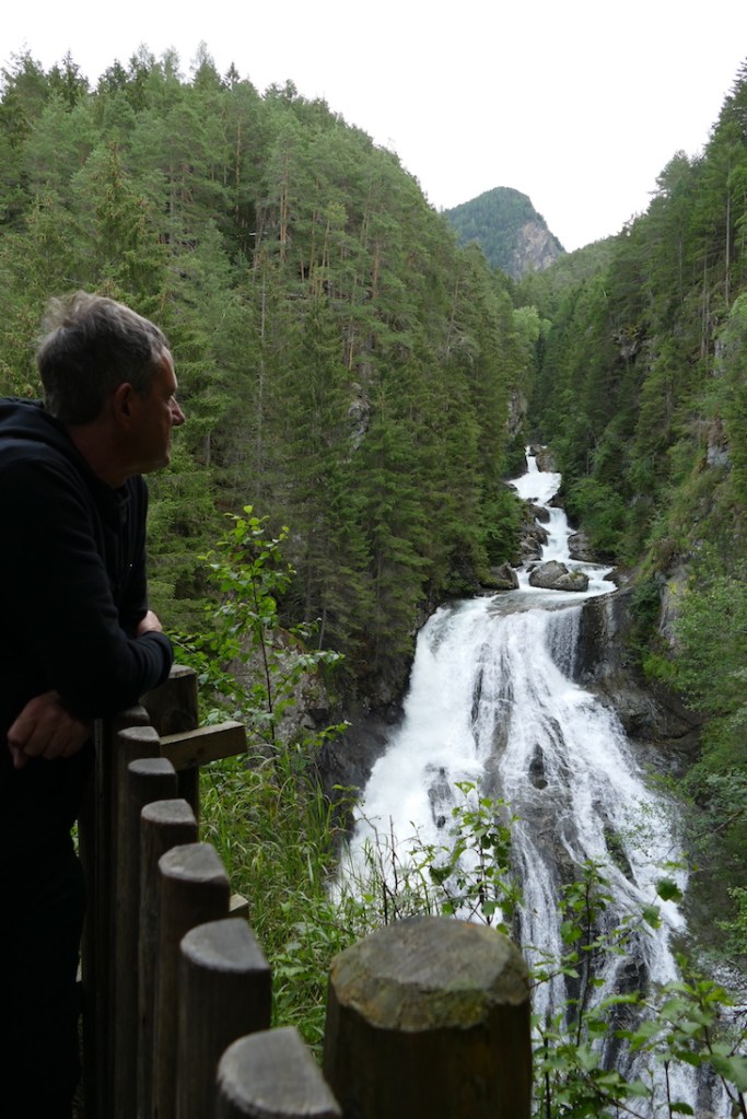 Da das Wetter nicht ganz so optimal war, haben wir uns für eine Wanderung zu den Reinbach Wasserfällen und eine Fahrt mit der Fly-Line entschieden. Der Parkplatz bei der Wasserfall-Bar (Wasserfallweg, 1, 39032 Sand in Taufers) ist bereits gut gefüllt. Am Automaten auf dem Kiesparkplatz haben wir für 3 Stunden 3 Euro bezahlt, das Tagesticket kostet 6 Euro. Die Wasserfall-Bar ist ein schöner Einkehrort. Ein moderner, offener Bau mit viel Holz und individuell gestalteten Sitzmöglichkeiten im Außenbereich – schaut sehr einladend aus. Aber erstmal geht es nach oben.