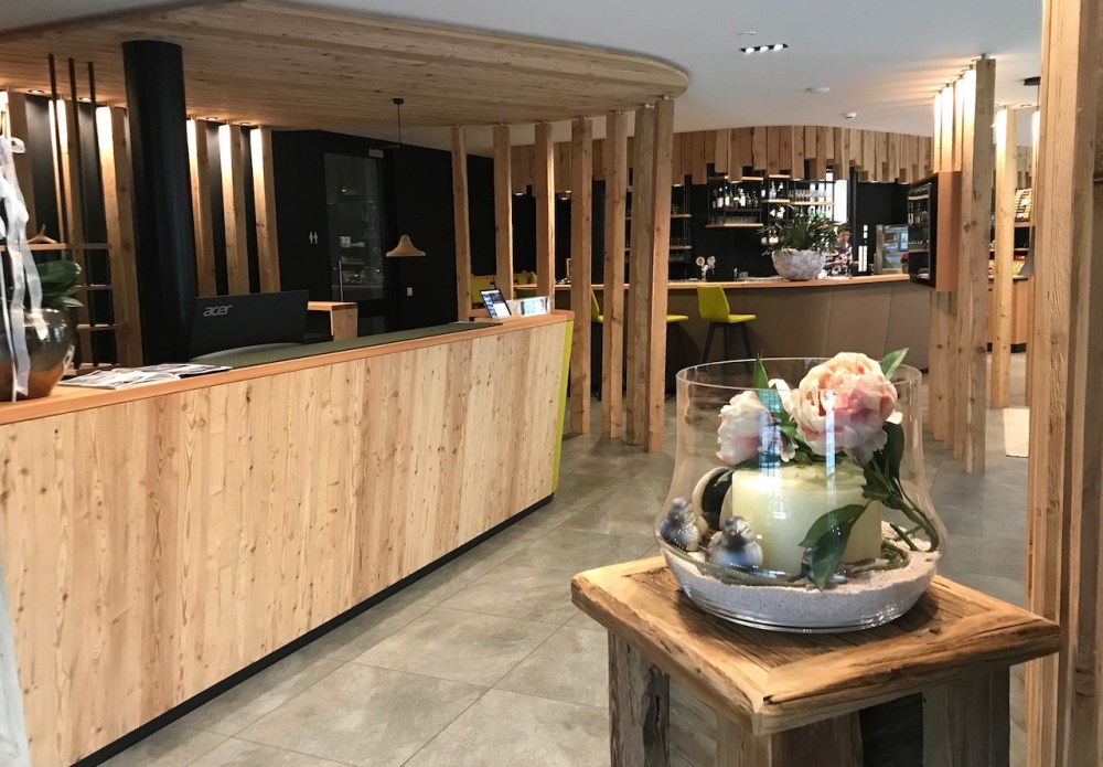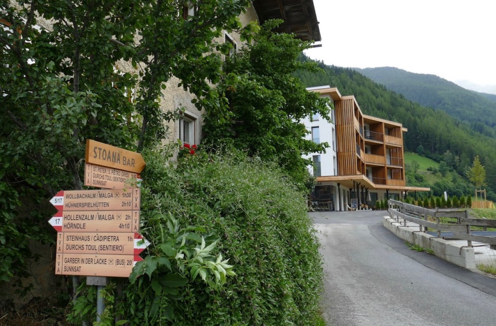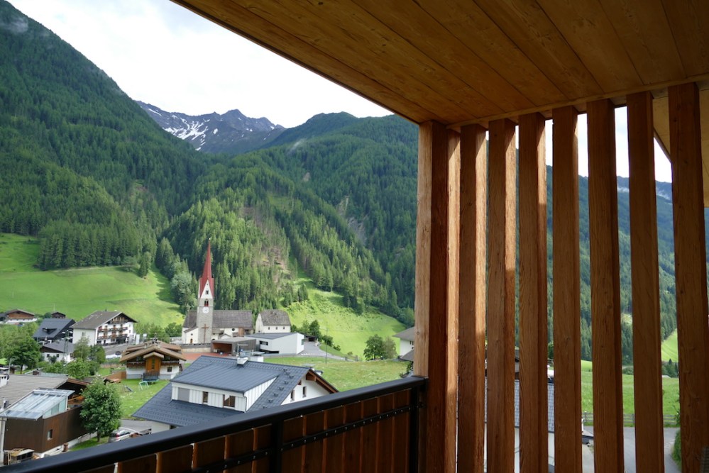 Dadurch, dass die Strassenbezeichnung auf Oberbühel 20 – 39030 St. Jakob geändert wurde, fand unser Navi die Adresse nicht. Aber kein Problem, von der Hauptstrasse aus ist das Hotel gut ausgeschildert und die markante Holz-Fassade oben auf dem Sonnenhügel, in unmittelbarer Nähe zur Kirche, gut sichtbar. Beim nächsten Navi-Update dürfte das behoben sein 😉