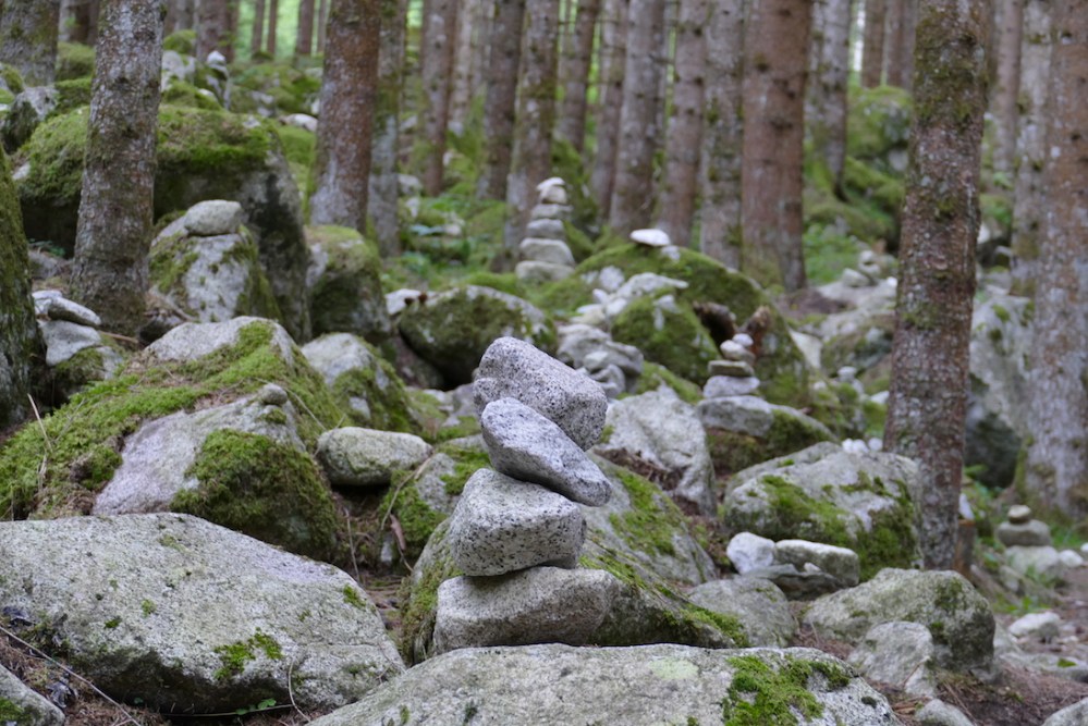 Auf dem wunderschön angelegten Besinnungsweg des Hl. Franziskus schlängeln wir uns nach oben. Eine leichte Wanderung durch den Wald mit sehr beeindruckenden Wasserfällen verspricht diese Tour im Ahrntal in Südtirol. Am Wegesrand stehen Kunstwerke, aber auch viele Steinmännchen, die von großen und kleinen Besuchern gebaut wurden.