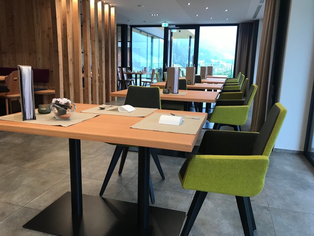 Fixe Essenszeiten oder eine Abendmenü gibt es hier im STOANA nicht. Vielmehr hat der Gast die Wahl aus täglich wechselnden Tagesgerichten (5-19 Euro) die nach Lust und Laune dazu gebucht werden können und Getränken an der Bar von 7:30 bis 21:00 Uhr. Es wird aber auf Vorbestellung auch alles für eine leckeres Käsefondue mit einer eigens kreierten Bergkäsemischung und heimischen Zutaten oder für ein Fleischfondue samt Fleisch, Saucen und passendem Gemüse inkl. Weinempfehlung vorbereitet und ins Appartment geliefert zum einfachen Zubereiten in den eigenen vier Wänden – pro Person 22 Euro + Weinflasche.