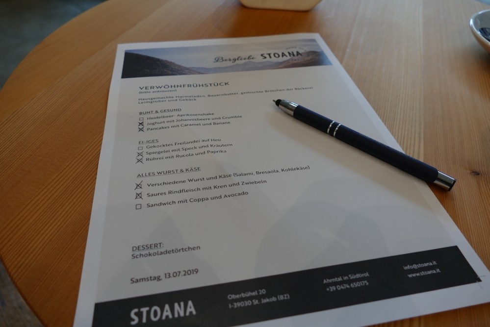 Bereits bei der Ankunft wählt man aus den Vorschlägen sein persönliches Frühstück aus. Für die weiteren Tage, liegt am Frühstückstisch jeweils der Menüvorschlag zum Ankreuzen bereit.