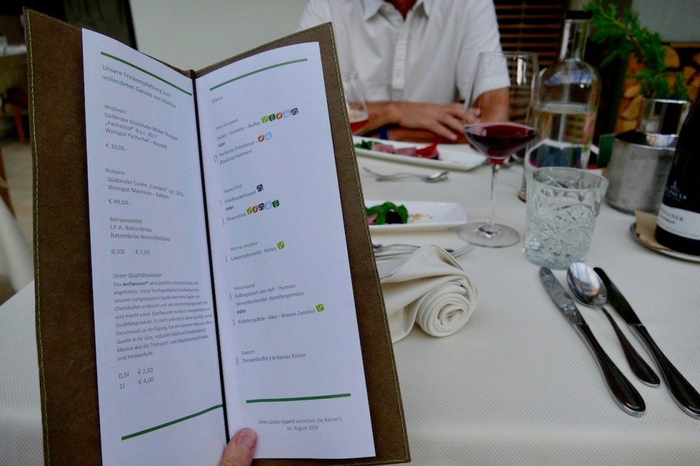 Neben vielen Südtiroler Weinen, gibt es auch jeden Abend eine Getränkeempfehlung. Dabei war auch das Bier „Wuida Hund“. An der Bar haben wir später den selbstgemachten Zirbenlikör vom Senior-Chef und einen Zirbenschnaps probiert.