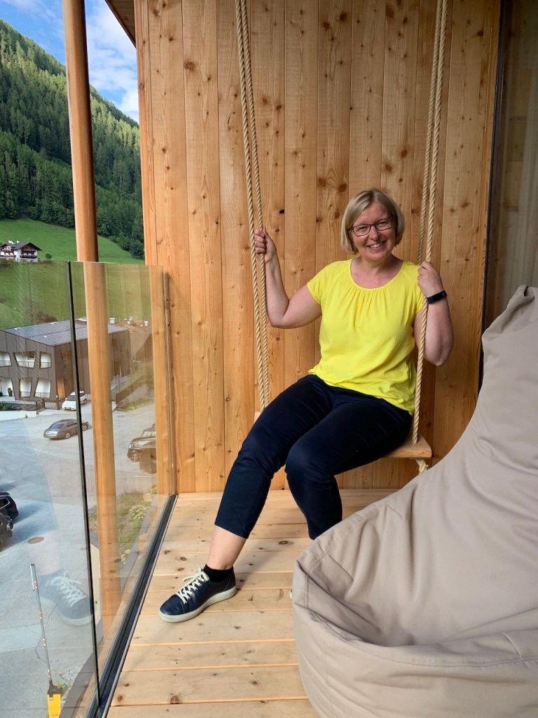 Zu meinem persönlichen Lieblingsplatz ist sofort die handgefertigte „Loslasser Zirben-Schaukel“ geworden, die es auch im hauseigenen Natur-Shop „Naturado“ zu kaufen gibt. Das aktive, bewegte Sitzen soll in vielerlei Hinsicht deutlich besser sein als eine starre Sitzposition. Kann ich nur bestätigen. Hier auf der Schaukel sitzen und dazu dieser Blick raus in die Natur, mehr braucht es gar nicht.