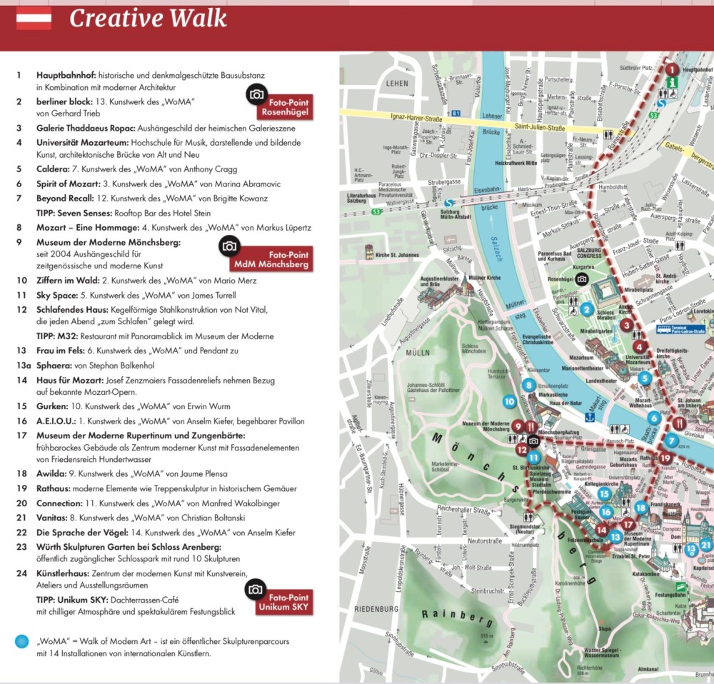 Von 2002 bis 2010 wurde jedes Jahr ein Künstler eingeladen, ein Werk eigens für den öffentlichen Raum der Weltkulturerbestadt zu konzipieren und umzusetzen. Das Kunstprojekt „Walk of Modern Art“ führt zu den schönsten Plätzen der Altstadt Salzburgs und an versteckte Orte, an denen man eine Begegnung mit Kunst nicht unbedingt erwartet.