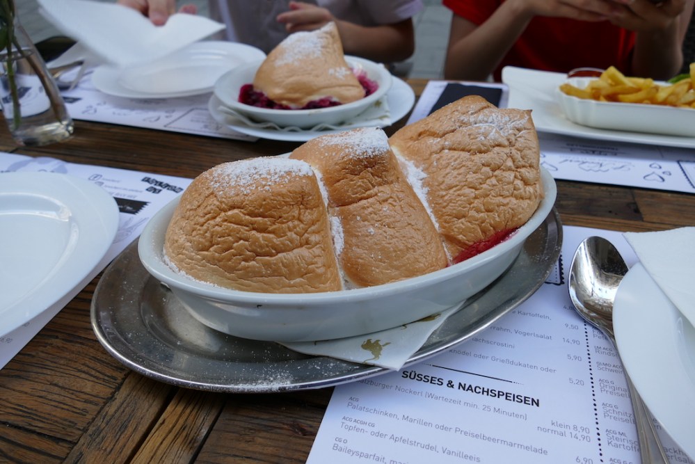 Die wohl berühmteste Spezialität aus Salzburg sind die Salzburger Nockerl. Erfunden von der Mätresse eines Salzburger Fürsterzbischofs im 17. Jahrhundert repräsentieren die drei Gupf aus Zuckerschnee die verschneiten Salzburger Hausberge – den Mönchsberg, den Kapuzinerberg und den Gaisberg.