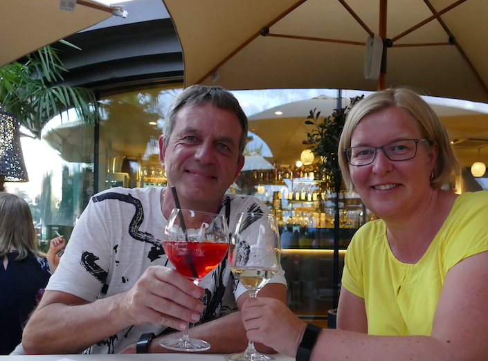 Also über den Mozartsteg zurück über Salzach links zu unserem Hotel und rauf in den 7. Stock auf einen Sundowner.