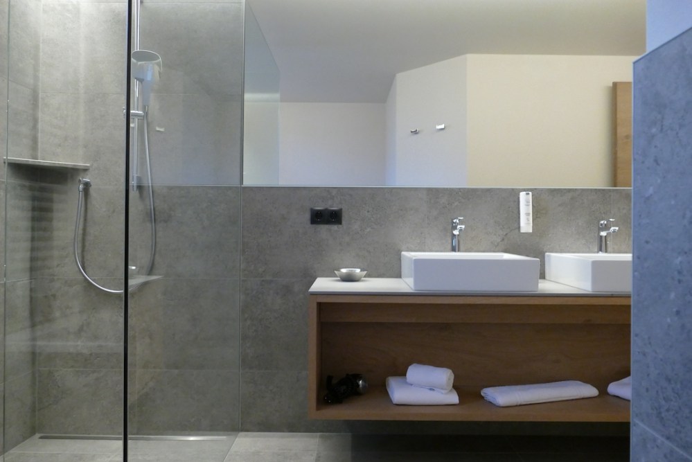 Grosses modern gestaltetes Badezimmer mit ebenerdiger Dusche, Doppelwaschbecken, Badewanne und separatem WC – Bidet.