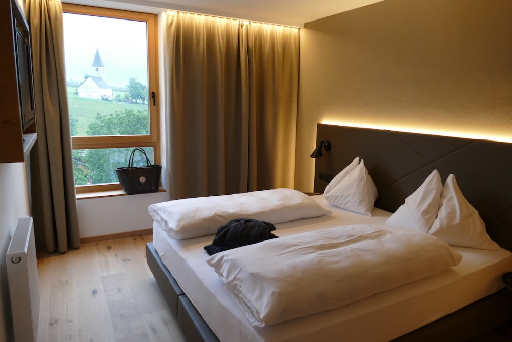 Vom Schlafzimmer haben wir einen idealen Blick auf unser Lieblings-Kirchlein gegenüber. Die Betten sind super bequem, der Schrank bieten viel Stauraum, dazu ein Safe, TV-Bildschirm und die gepackte Badetasche mit flauschigen Bademänteln und Badehandtüchern.