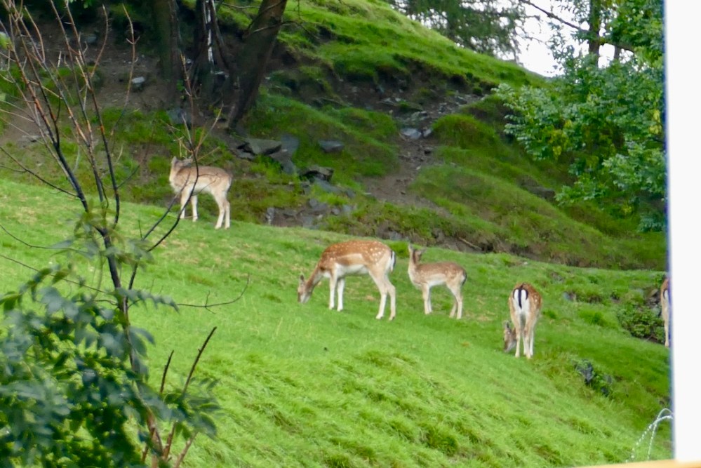 Auch auf den Besuch beim hauseigenen Dammwildgehege gleich hinter dem Hotel mussten wir witterungsbedingt leider verzichten. Die sonst sehr zutraulichen Tiere finden bunte Regenschirme nicht spannend.