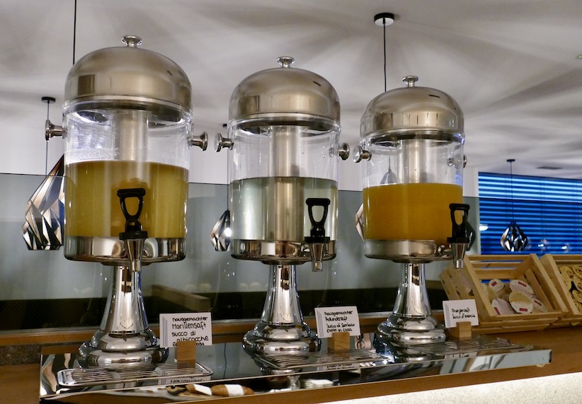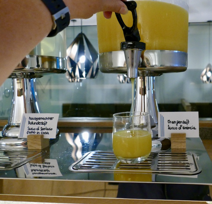 Am zweiten Tag geniessen wir die Auswahl am Frühstücksbüffet. Zuerst Hände desinfizieren und Maske ist natürlich Pflicht, wenn wir uns im Raum bewegen. Am Platz können wir sie ablegen.
