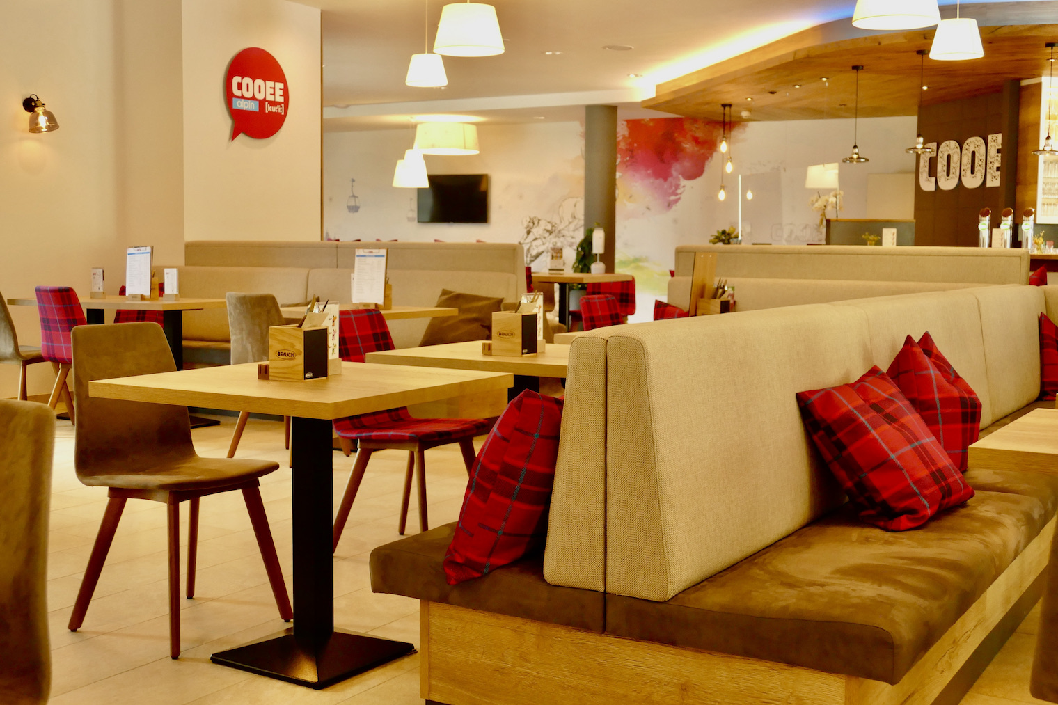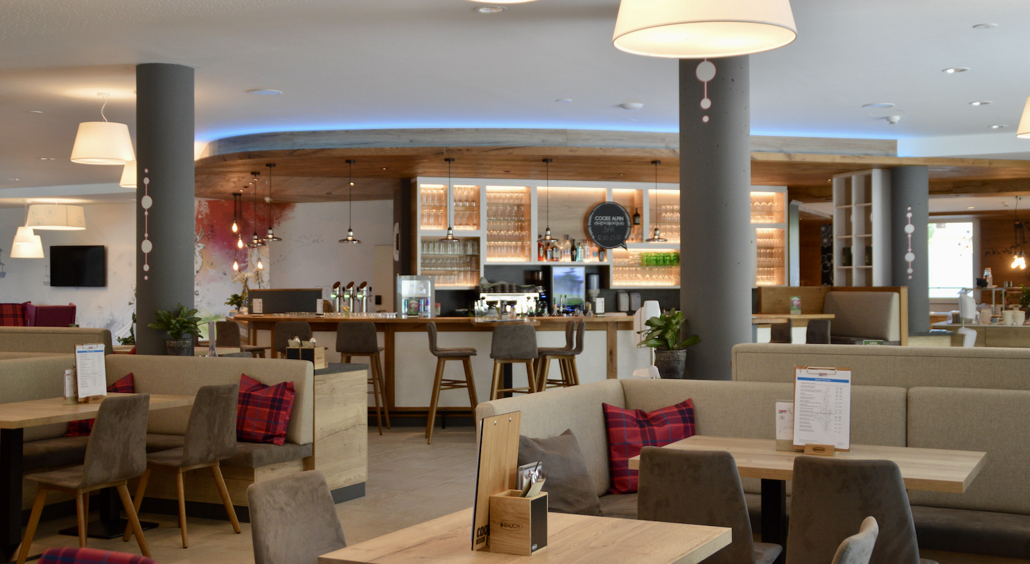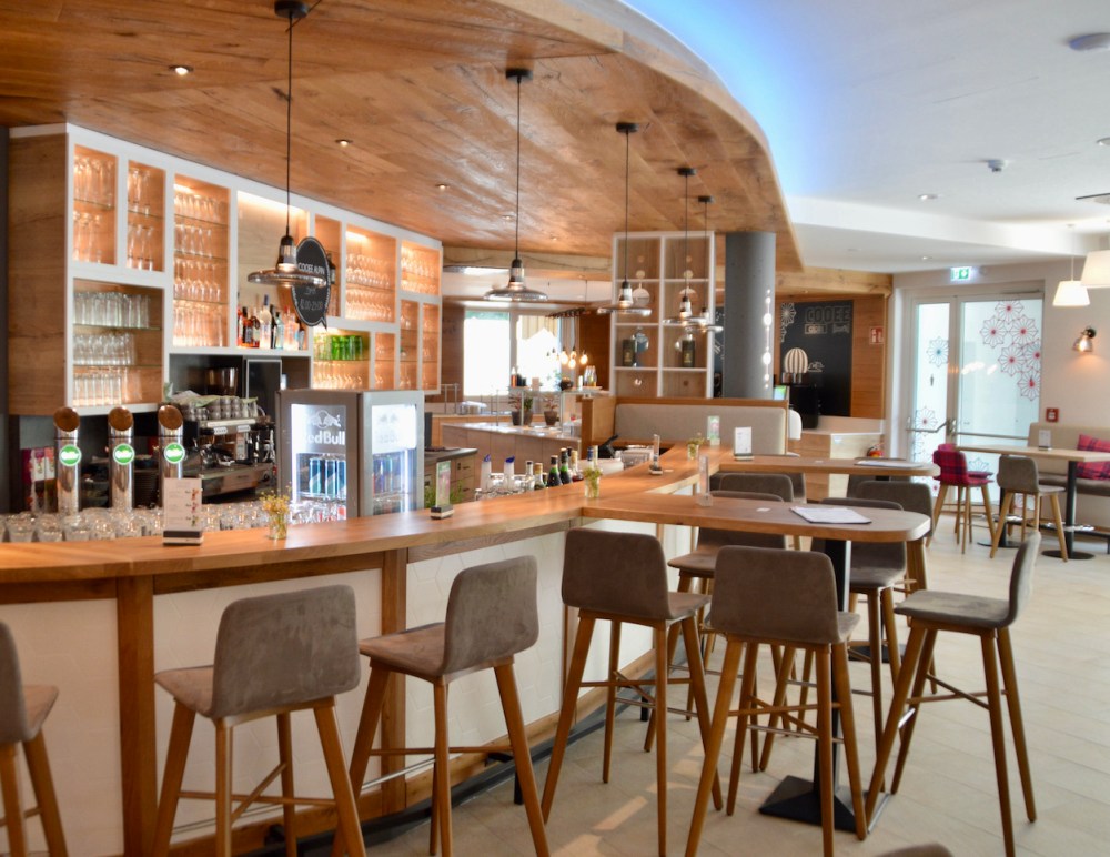 Die COOEE alpin Bar und das Restaurant sind das Herzstück des Hotels, gleich neben der Rezeption.