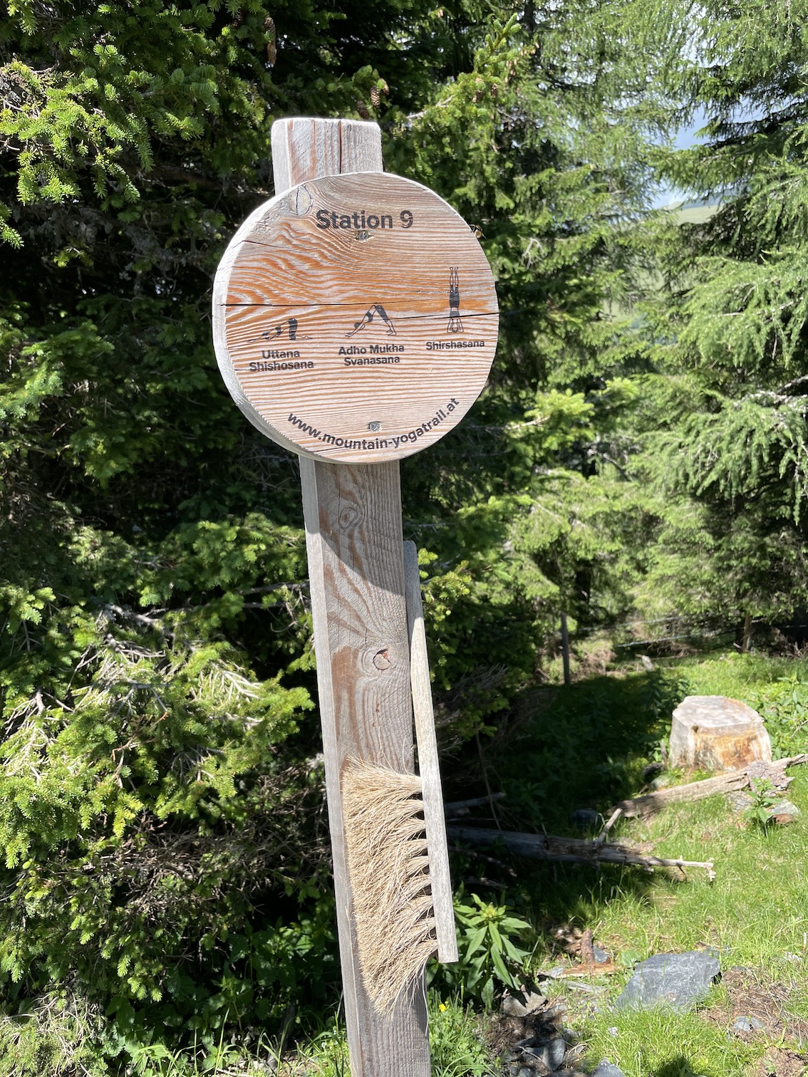 10 Stationen in idyllischer Umgebung in einem kleinen Waldstück warten auf dich. An jeder Station ist eine Holzplattform und eine Holztafel mit der Erklärung der entsprechenden Yoga-Übung.