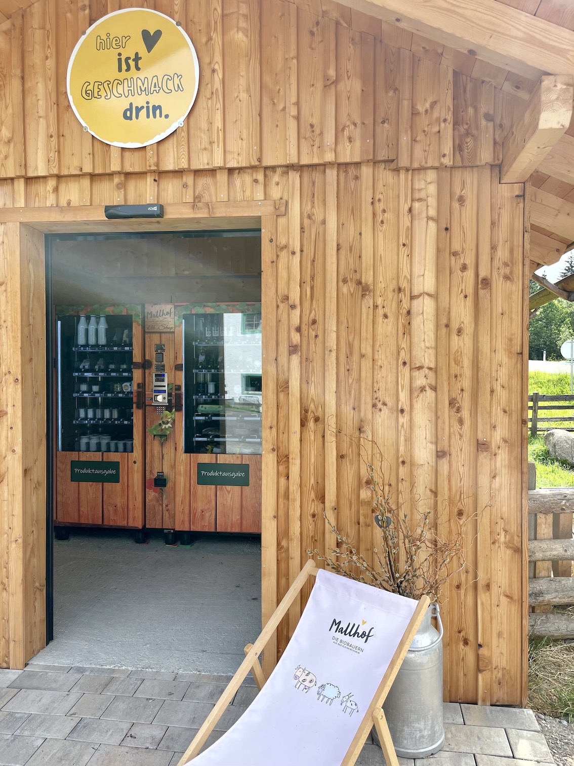 Wenn der Hofladen der Molkerei geschlossen ist, könnt ihr euch rund um die Uhr am Genuss-Automaten eindecken. Aber lasst was für uns übrig!