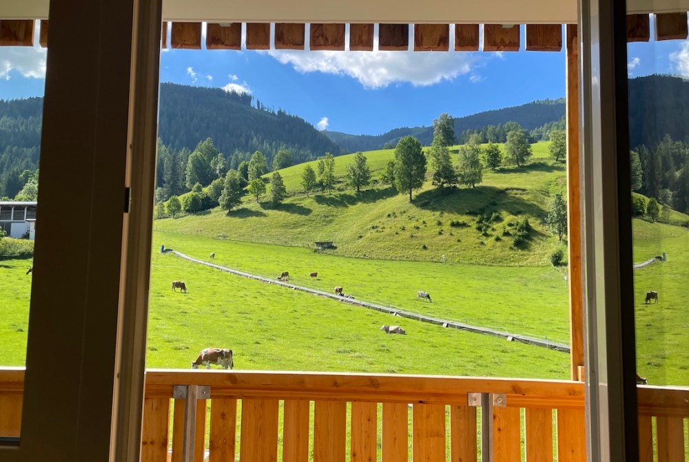 In den Kaiserburg-Zimmern habt ihr den Logenplatz, im Winter mit Blick auf die Skipiste und das Ski-Kinderland. Also lässig vom Balkon den Kids beim Skifahren zuschauen. Im Sommer ist Kuh-Watching angesagt.