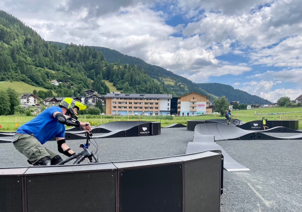 Bevor es mit der Bergbahn ganz nach oben zum längsten Flow Country Trail Europas geht, könnt ihr euch hier in den Bike Parcours schon mal warm fahren.