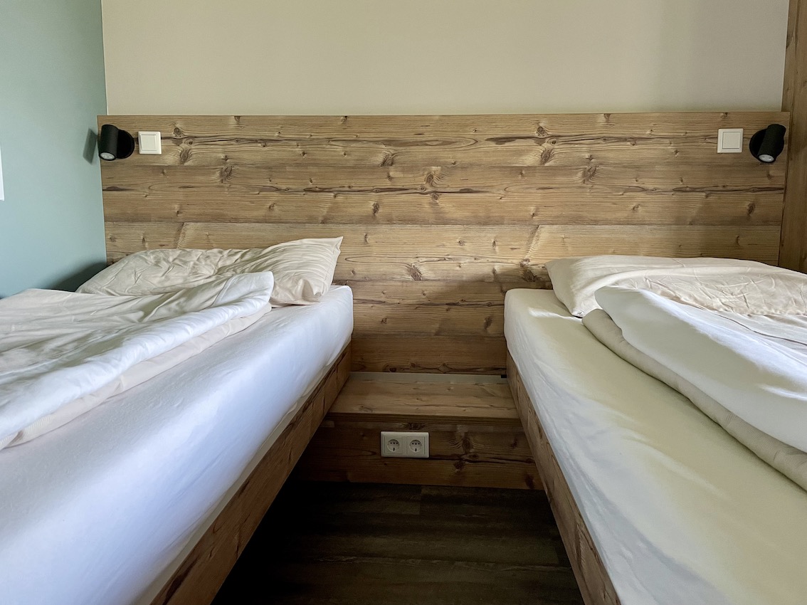 Ein besonderer Clou sind die leicht verschiebbaren Betten. Einfach oder genial mit einer Schiene umgesetzt. So könnt ihr euch die Betten stellen, wie ihr es möchtet, zusammen oder lieber auseinander. Eine Steckdose neben dem Bett habt ihr bei jeder Variante, da wurde echt klasse mitgedacht. Das Holzpodest dient gleichzeitig als Ablage bzw. ersetzt ein Nachtkästchen.