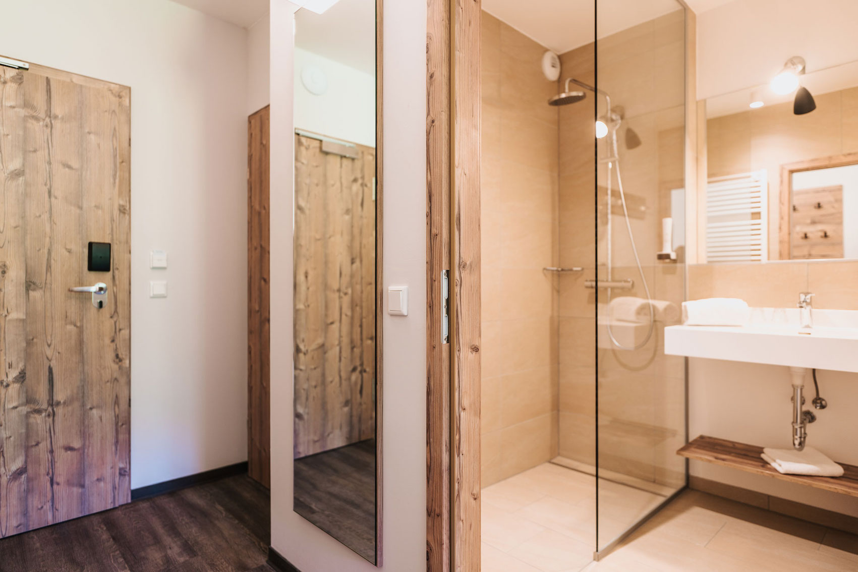 Kuschelige Handtücher, ein Handtuchwärmer, Fön und diese begehbare Dusche – das WC ist separat. Hier kannst du dich wohlfühlen.
