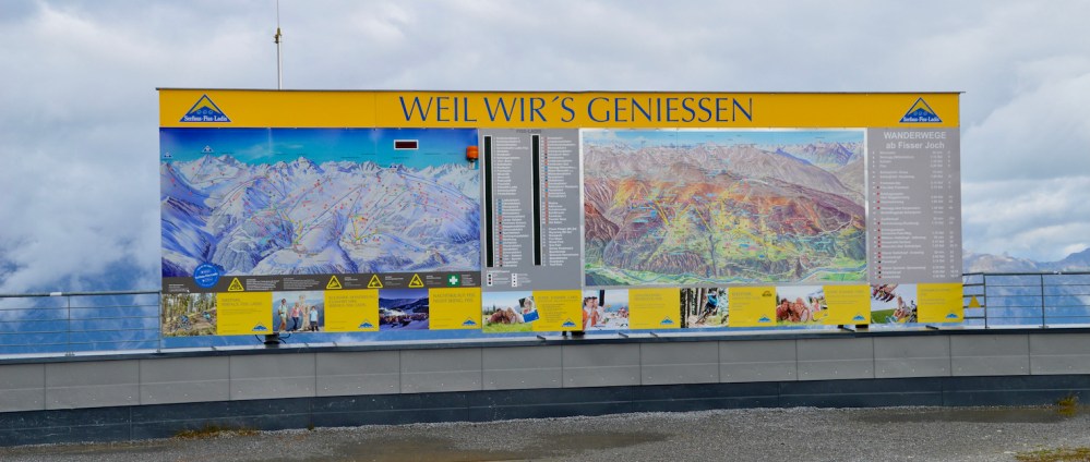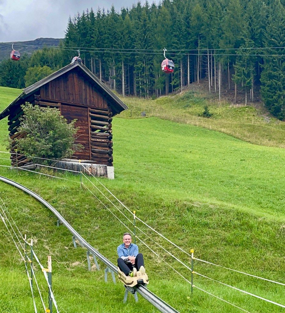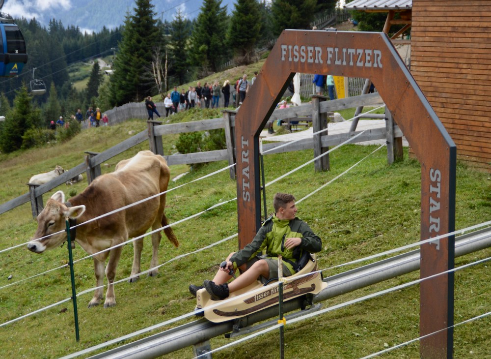 Während der Gondelfahrt nach oben sehen wir schon die kurvenreiche Strecke der Rodelbahn, dem Fisser Flitzer. Die Rodel werden einfach an die Gondeln gehängt und wieder nach oben transportiert. Es gibt also auch hier wieder viele Wege nach unten. Wandern, Gondelbahn oder Fisser Flitzer.