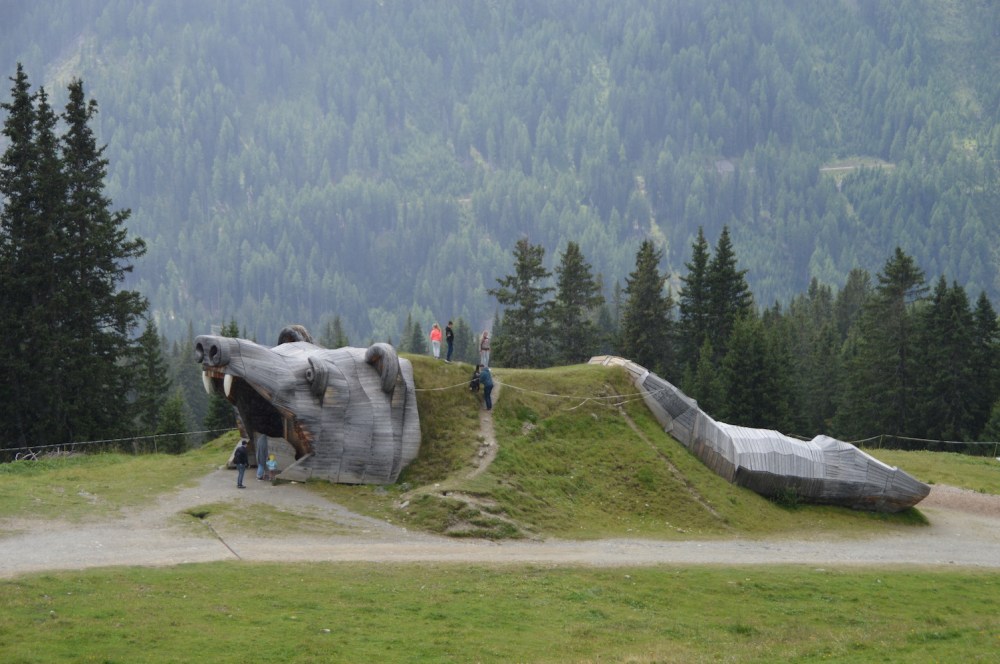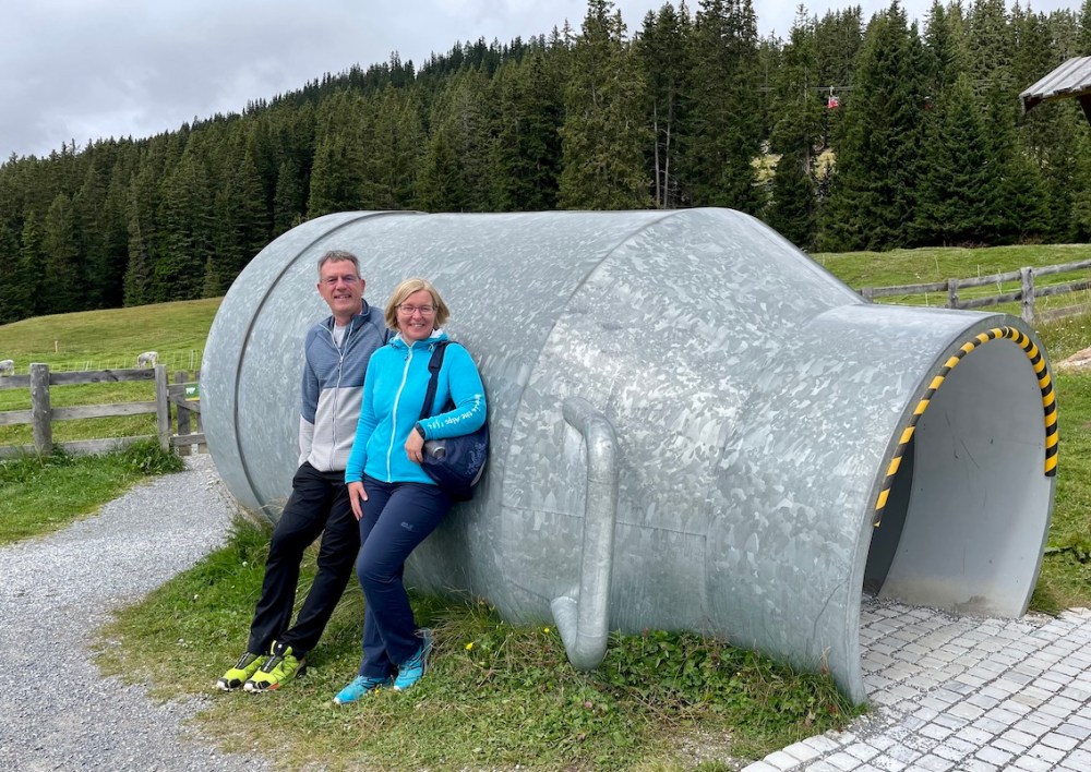 Ganz oben thront schräg der Riesenwürfel Crystal Cube. Daneben befindet sich die Aussichtsplattform Z1. In dem Kubus spiegelt sich bei schönem Wetter fantastisch die umliegende Bergwelt, ein tolles Fotomotiv. Dort hinauf führt der „Goldene-Mann-Weg“. Bei unserem Aufenthalt war es leider zu bewölkt, aber beide Hotspots wären ideal für schöne Fotos.