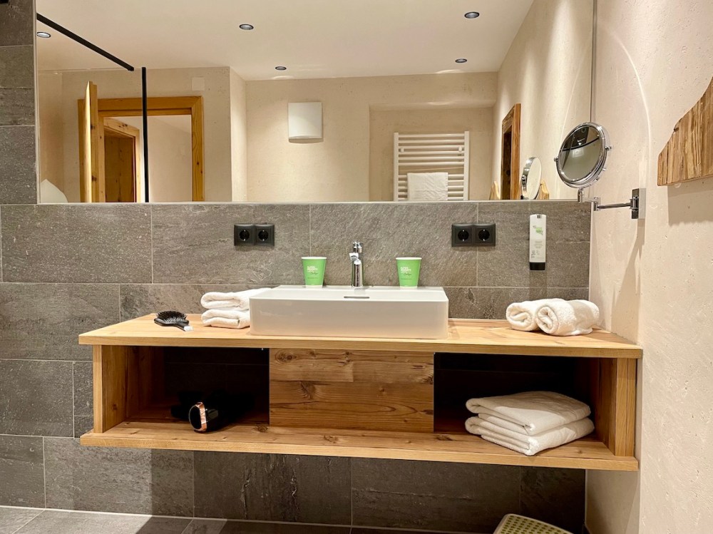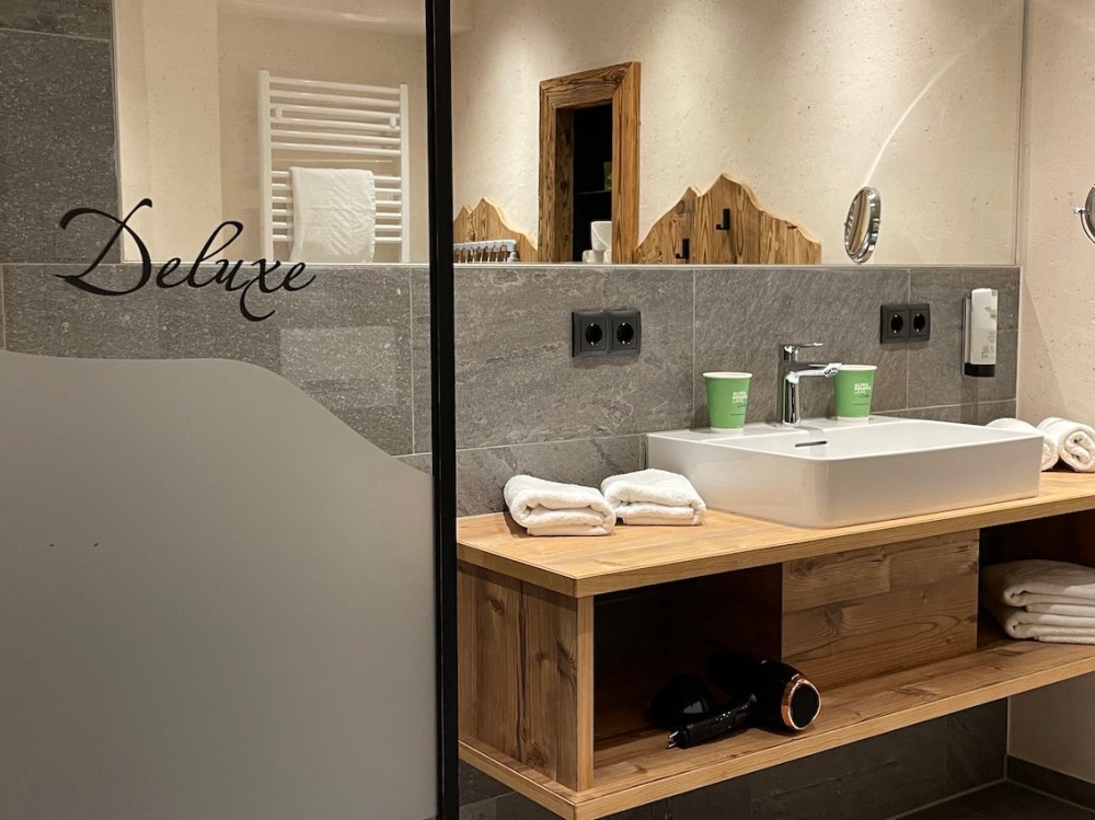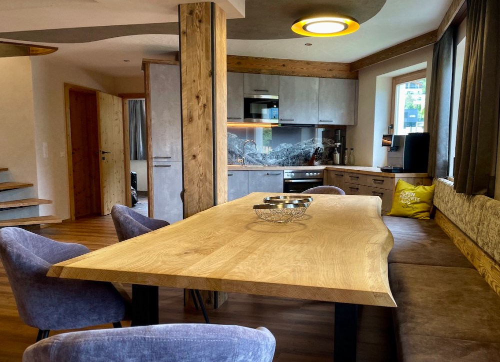 Alpiner Charme mit Holzboden, heimeliger Fussbodenheizung, einem mega-großen Holztisch und einem fast ebenso großen Flatscreen an der gegenüber liegenden Wand. Uns hat beim Fernsehen eigentlich nur noch eine gemütliche Couch zum Füße ausstrecken gefehlt.