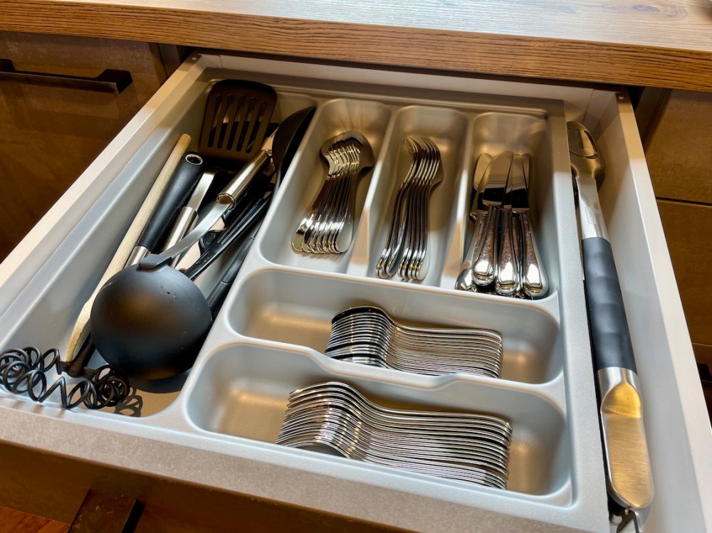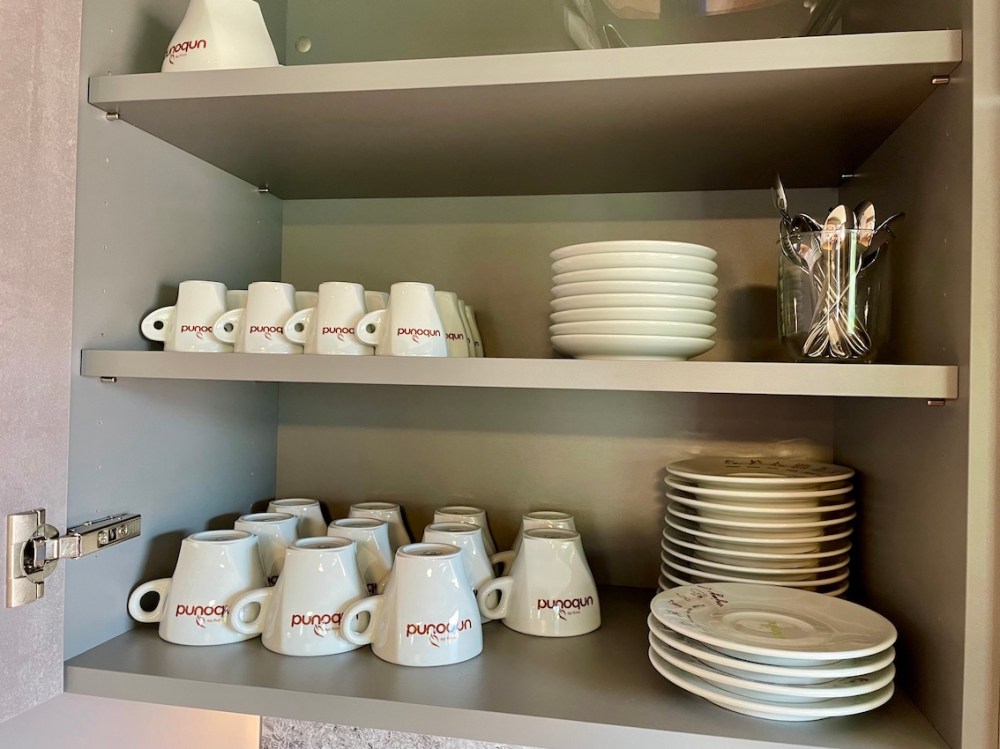 Alles da: Kühlschrank, Gefrierschrank, Geschirrspüler, Herd mit Cerankochfeld und Backofen, Mikrowelle, Kaffeeautomat mit Bohnen, Wassersprudler, Geschirr, Gläser und Besteck von WMF, …