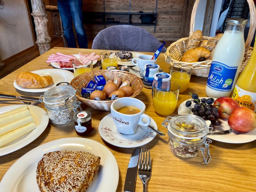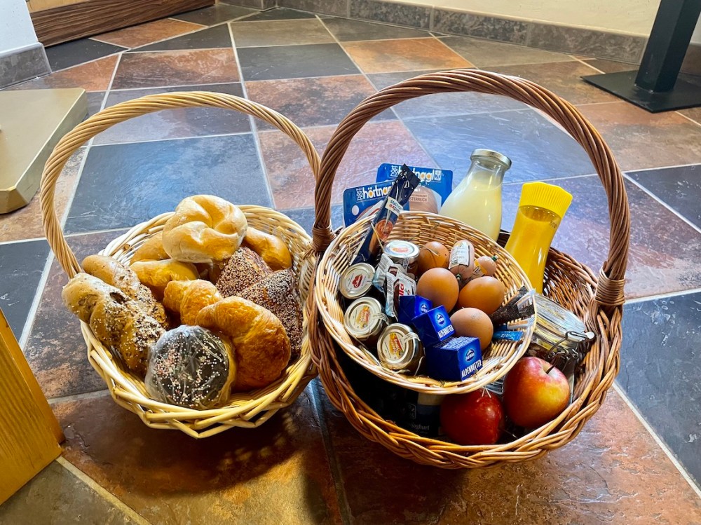 Einfach online am Vortag auf dem Tablet das Frühstück nach seinen Wünschen zusammen stellen und morgens den liebevoll gepackten Frühstückskorb vor der Tür ins Chalet holen.