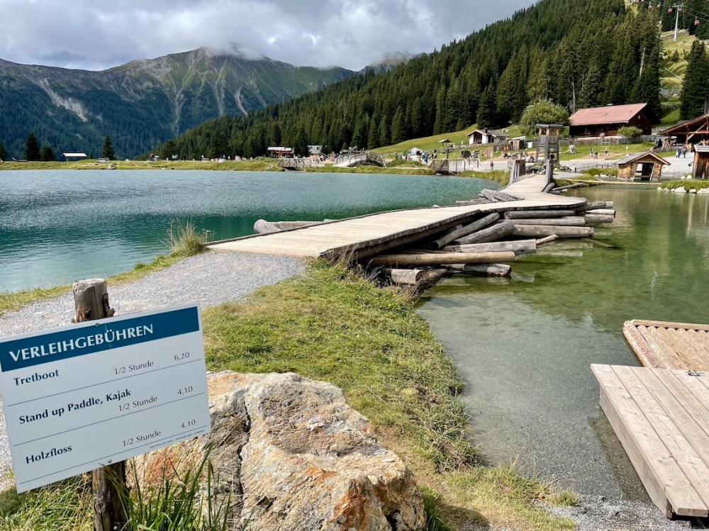Ihr könnt euch auch Tretboote, Stand Up Paddle oder Kajaks ausleihen oder mit dem Holzfloss einen Wasserparcour meistern.