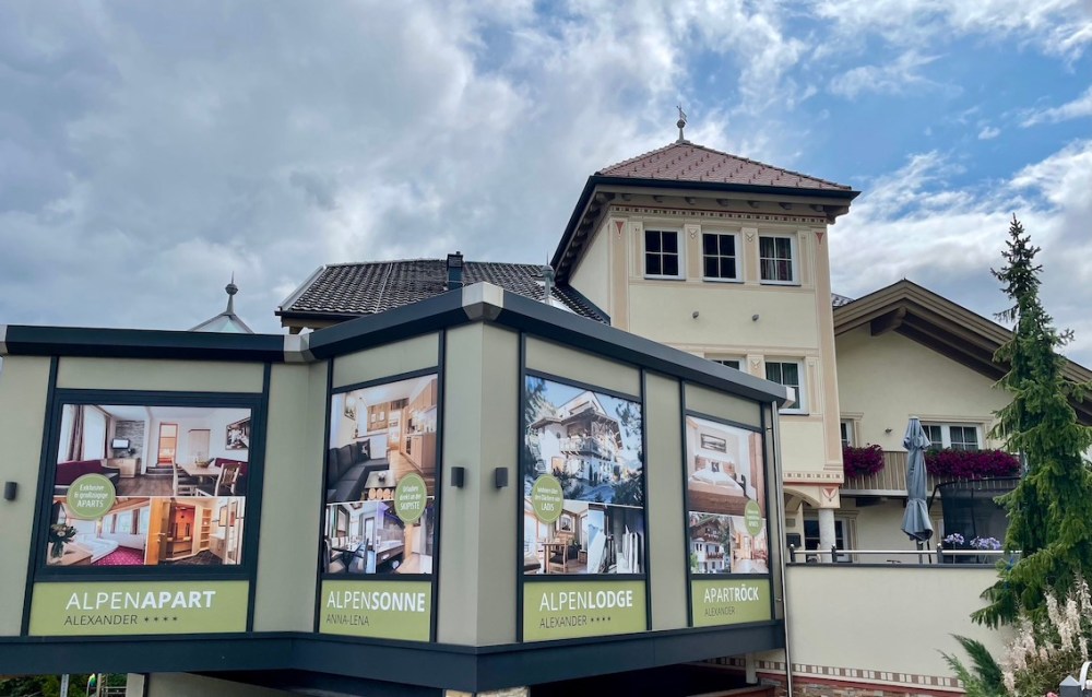 Der Check-In findet für alle Häuser hier im Stammhaus Alpenapart Alexander statt, unübersehbar in der Ortsmitte von Ladis.