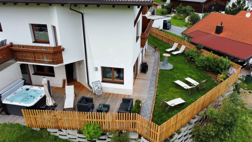 Holz-Terrasse mit Private Spa – Außenwhirlpool und finnischer Sauna – Gartenanteil mit gemütlichen Lounges und Relaxliegen.