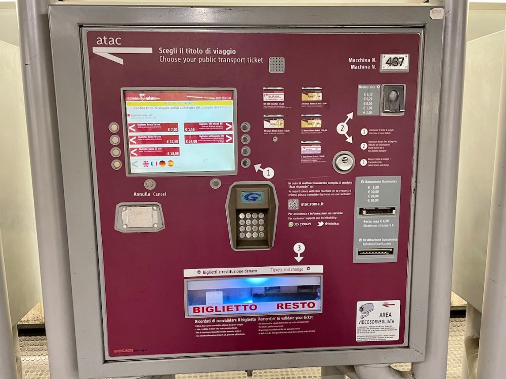 Die Tickets für Bus und Metro entweder am Automaten kaufen oder in einem der vielen Tabacchi-Läden. Auch hier am Automaten bei Bedarf einfach auf Deutsch durchs Menü führen lassen.