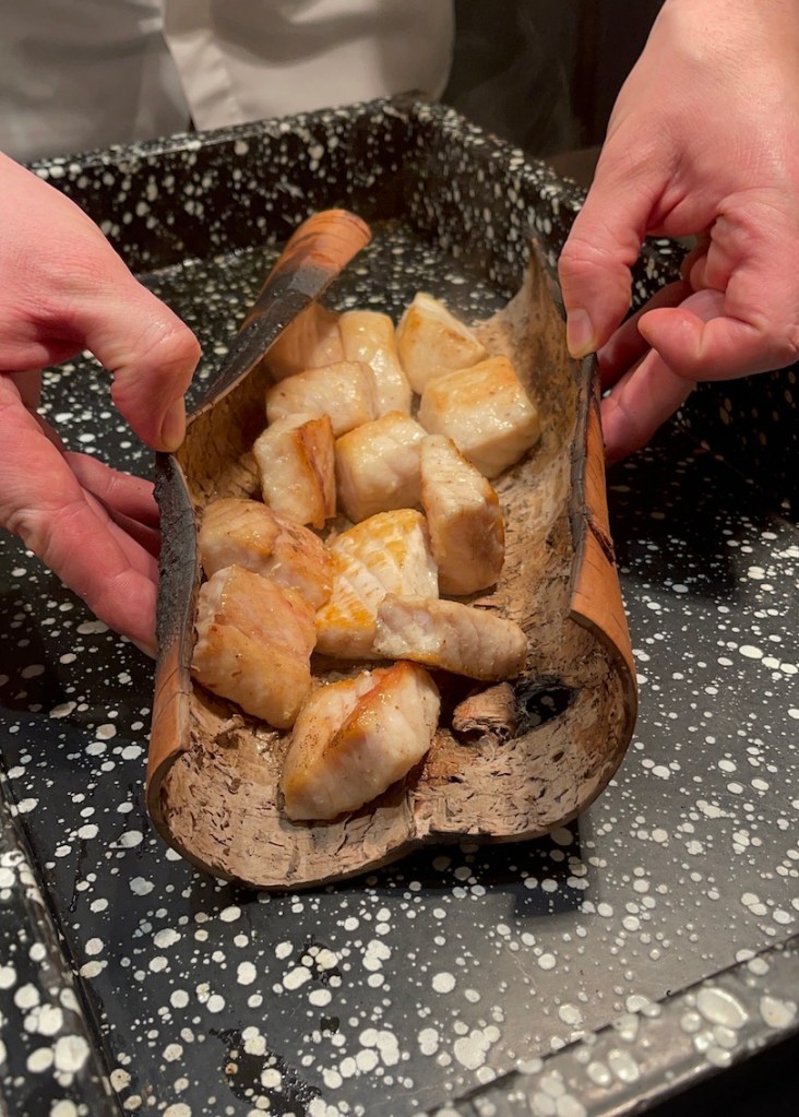 gebratener Stör, demnächst Waller, in der Birkenrinde geräuchert