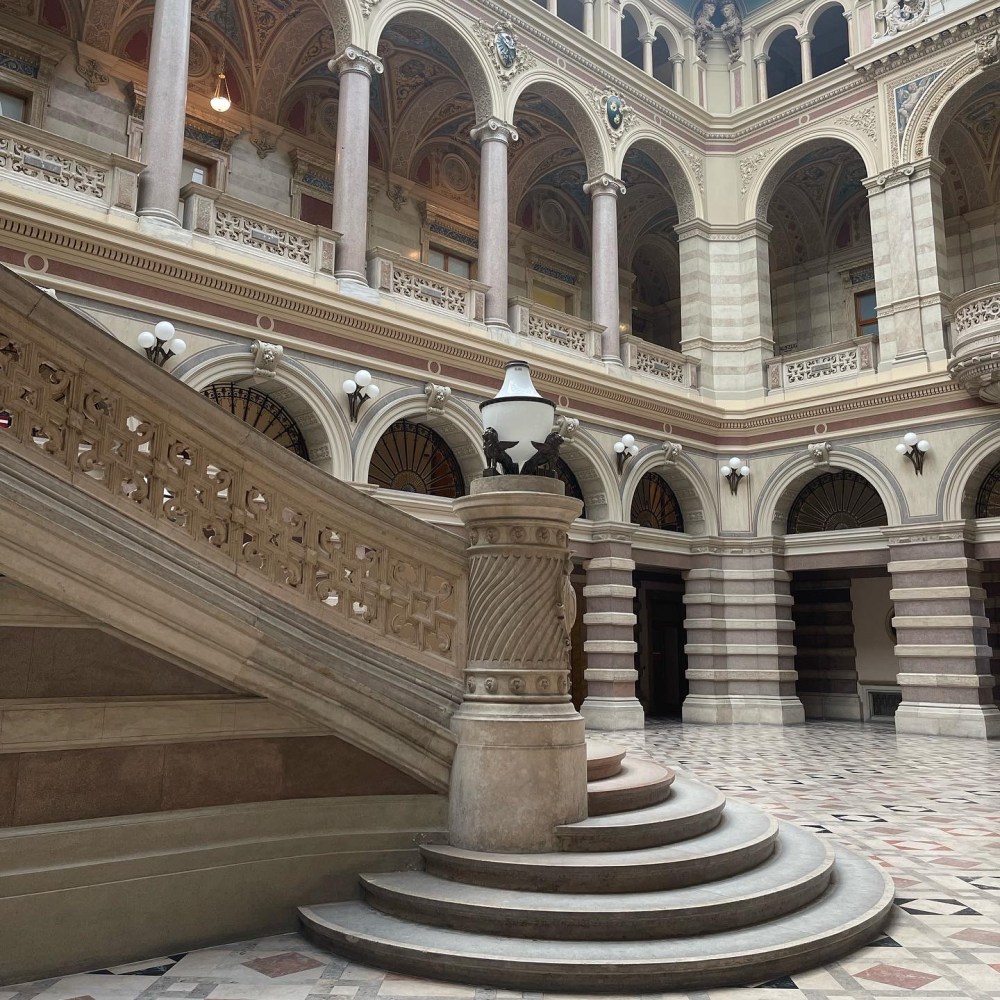 Mit der U-Bahn fahre ich bis zur Haltestelle Volkstheater und gehe weiter bis zum Schmerlingplatz. Nach einem kurzen Sicherheitscheck wie am Flughafen darf ich das imposante Gerichtsgebäude betreten und mich frei darin bewegen.
