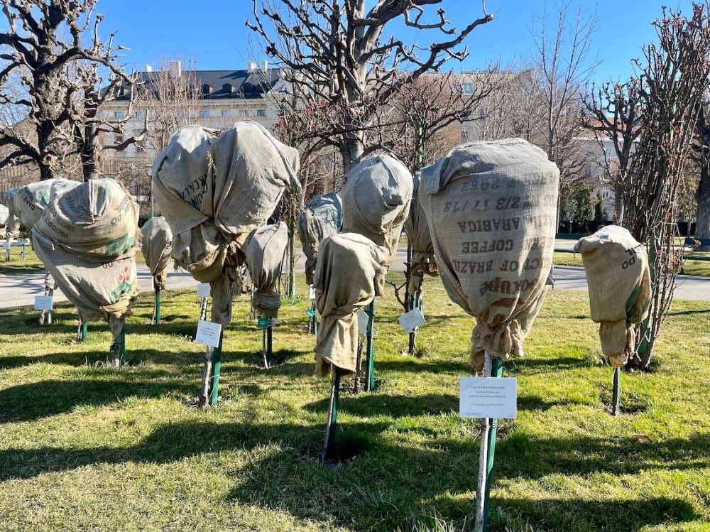 Über den Volksgarten, in dem die vielen Rosen noch winterfest eingepackt sind und wie kleine Kunstwerke von Christo aussehen,