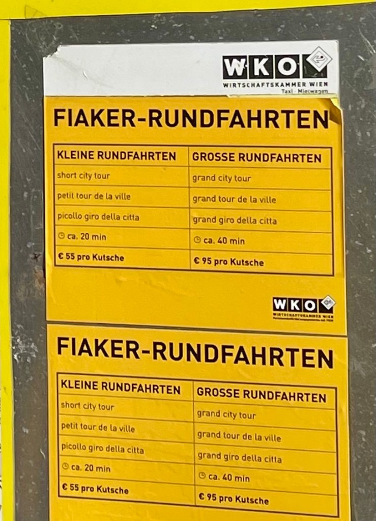 Pro Kutsche zahlt man für die kleine Rundfahrt von ca. 20 Minuten 55 Euro, für die große Tour von ca. 40 Minuten 95 Euro.
