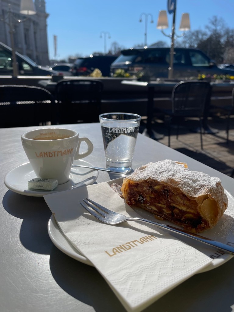 Die Sonne scheint, also genieße ich draußen auf der Terrasse den legendären Wiener Apfelstrudel.