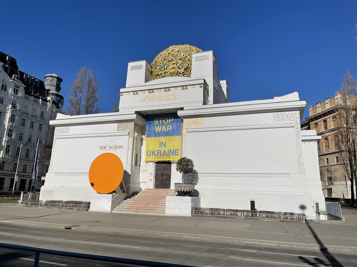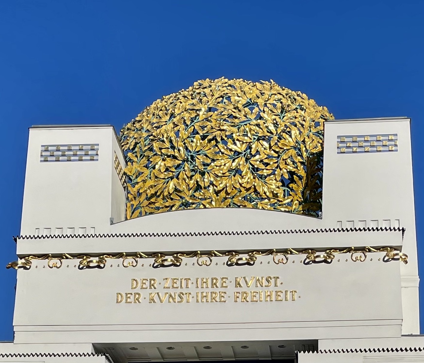„Der Zeit ihre Kunst. Der Kunst ihre Freiheit“ steht in goldenen Buchstaben an der Fassade. Besonders auffällig die goldene Kuppel aus Lorbeerranken über dem Ausstellungshaus für zeitgenössische Kunst.