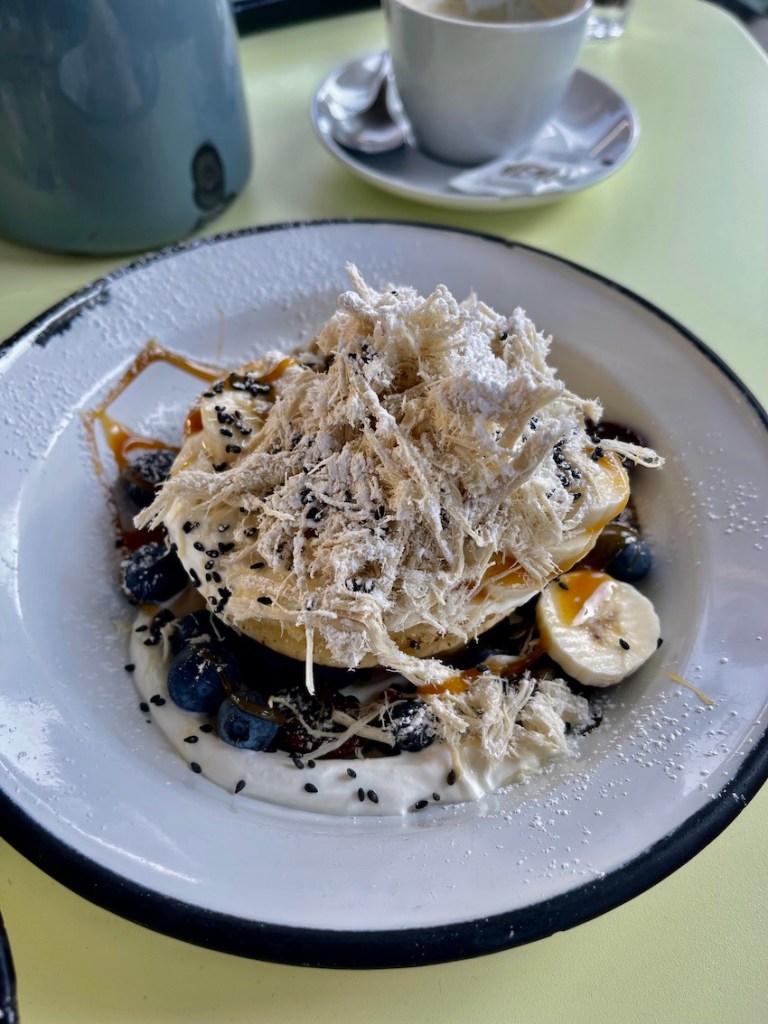 Wie wär es mit Salted Caramel Pancakes mit Banane, Heidelbeeren, Crème Fraîche, karamellisierten Pekannüssen, schwarzem Sesam, Har Bracha Halva und Limette – mmmhhh oder einem French Toast– hausgemachtes Challah Brioche, Mascarpone, Nussbutter, Himbeermarmelade, Haselnuss Crumble und Pistazien.