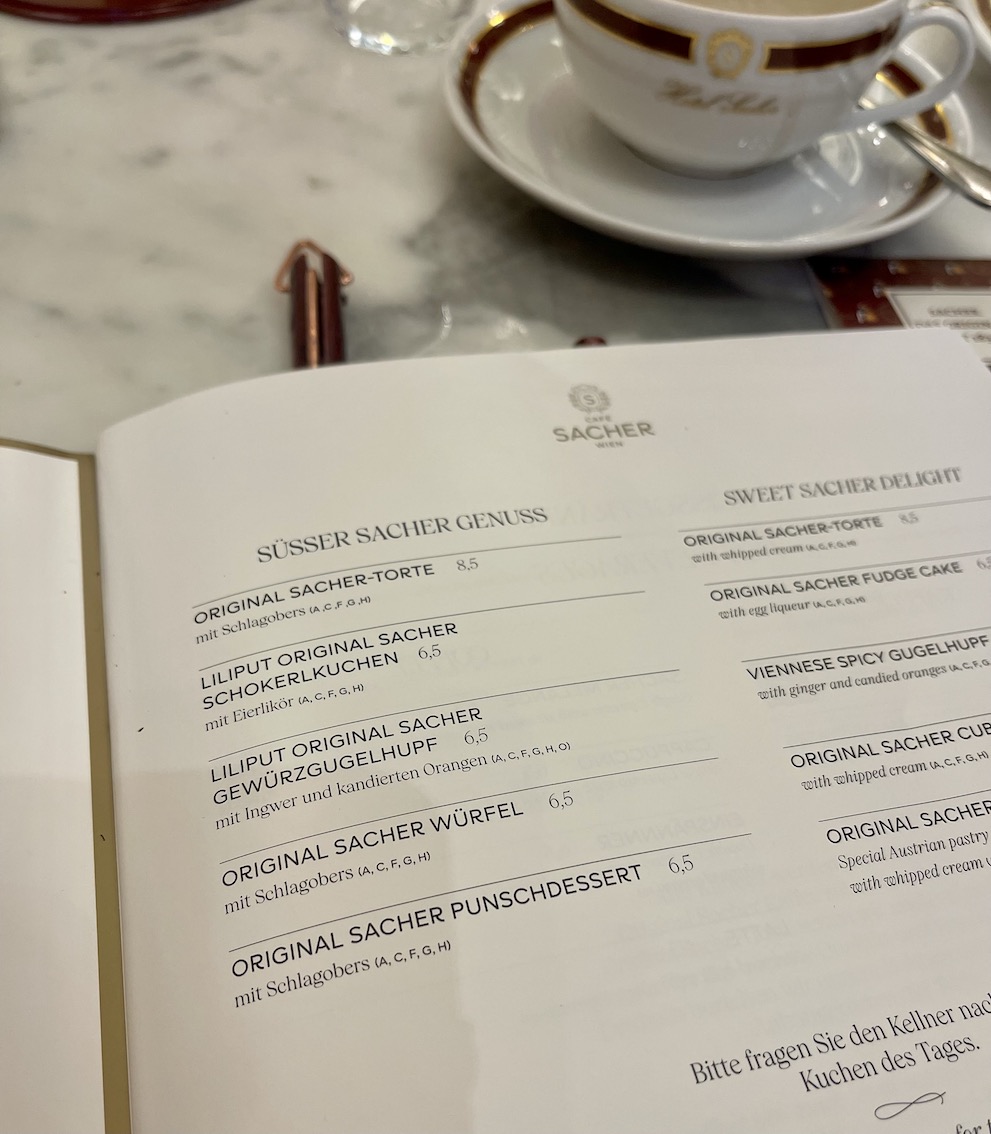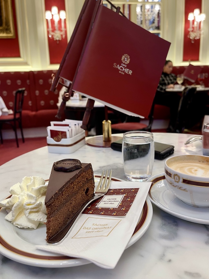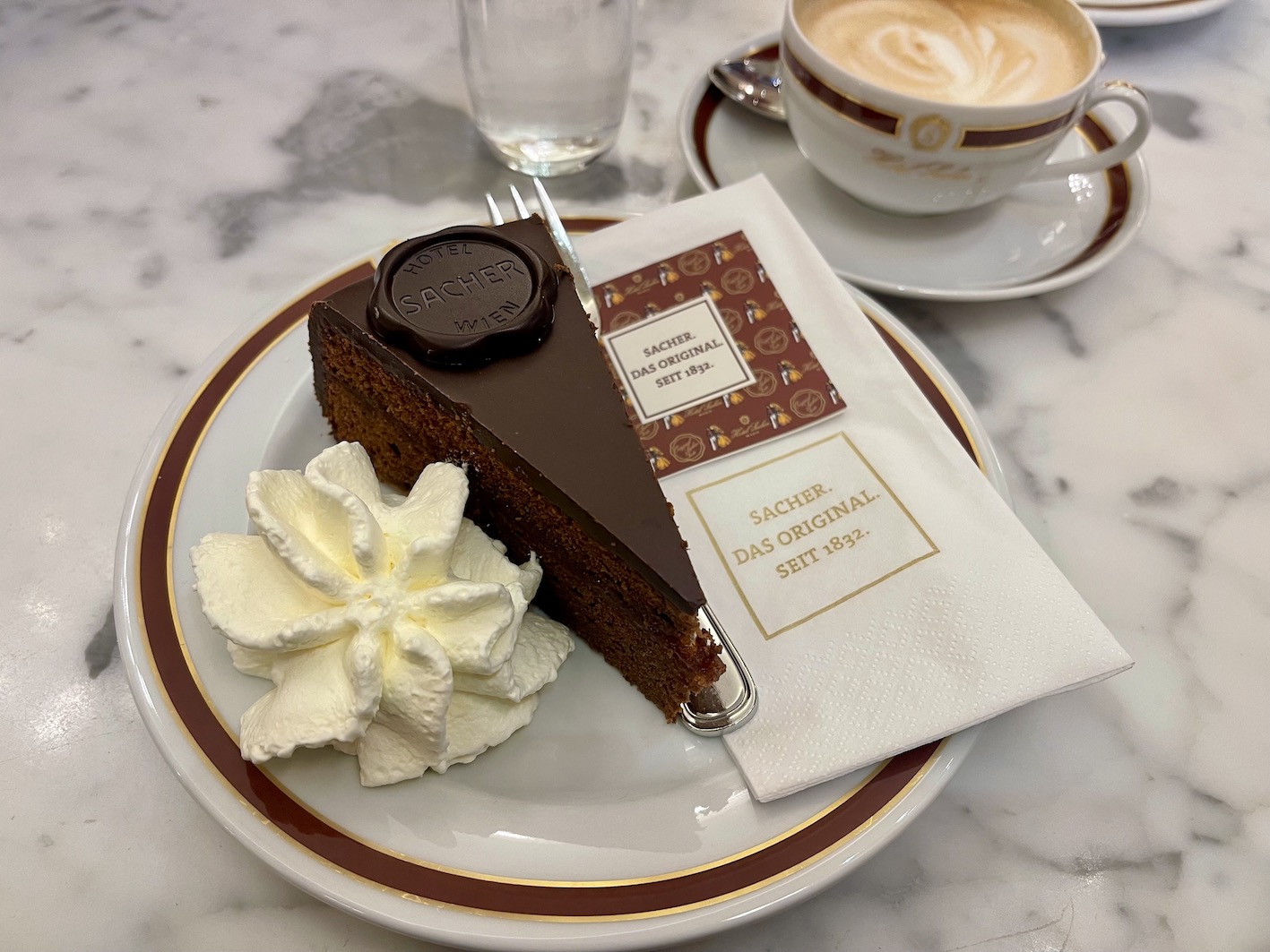 Was könnte wienerischer sein, als ein Nachmittag in diesem tollen Ambiente. Klassisch serviert wird die Original Sachertorte mit Schlagobers, aktuell für 8,50 Euro.