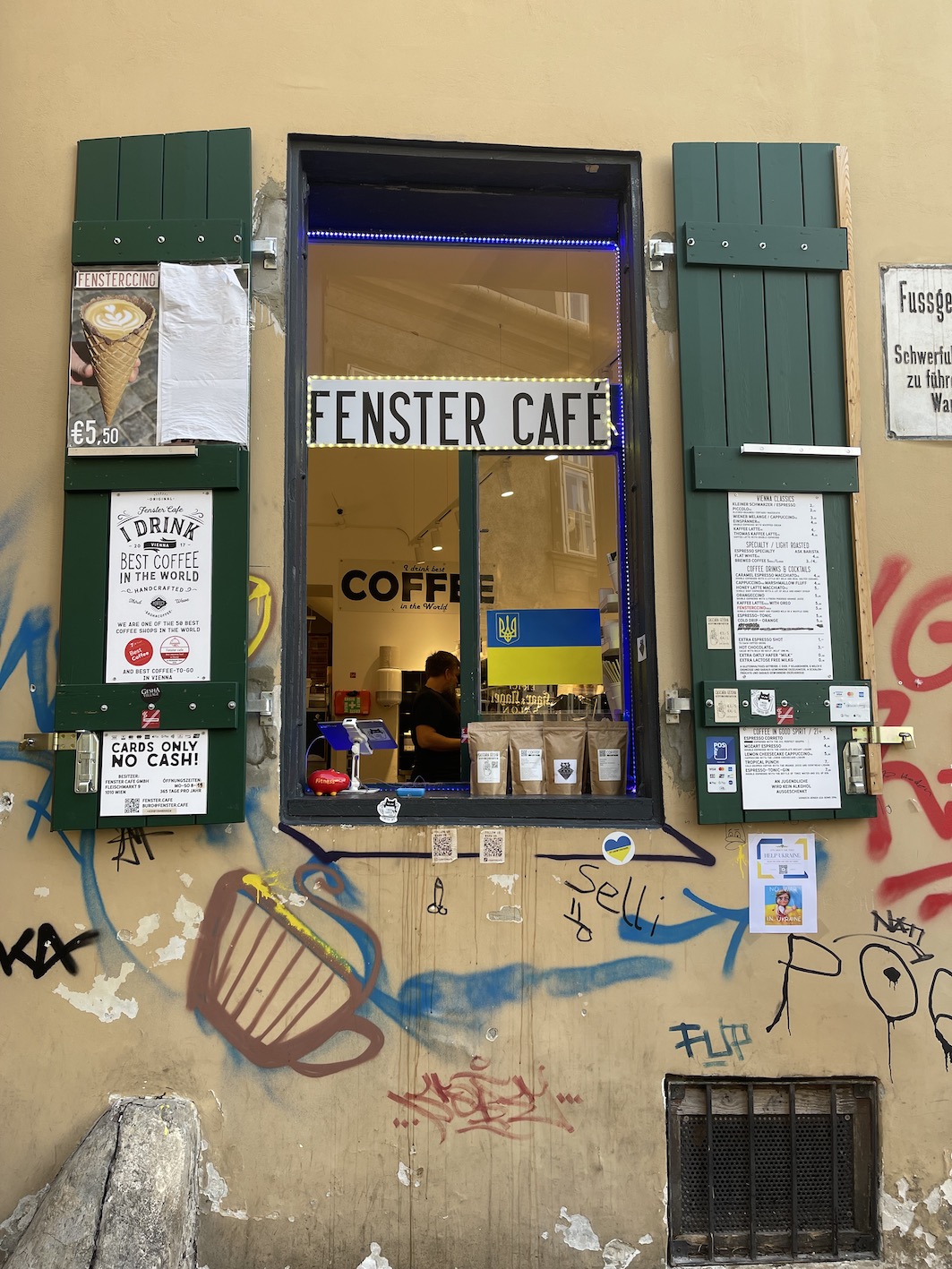 Hier haben wir auch erfahren, dass es seit Mitte Februar nur noch ein Original Fenster-Cafe auf der ganzen Welt gibt. Und das ist hier in der Nähe vom Schwedenplatz in Wien. Der zweite Ableger in Linz, der von einen Freund betrieben wurde, steigt aus dem Konzept aus und startet neu.