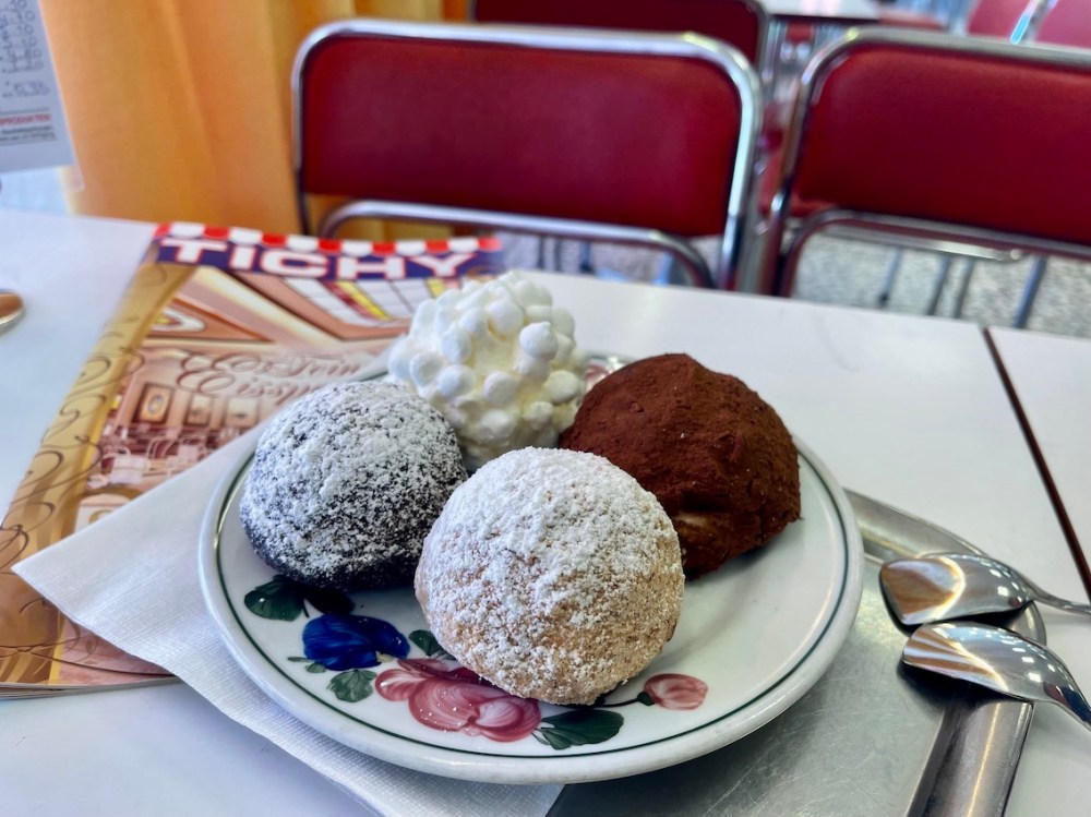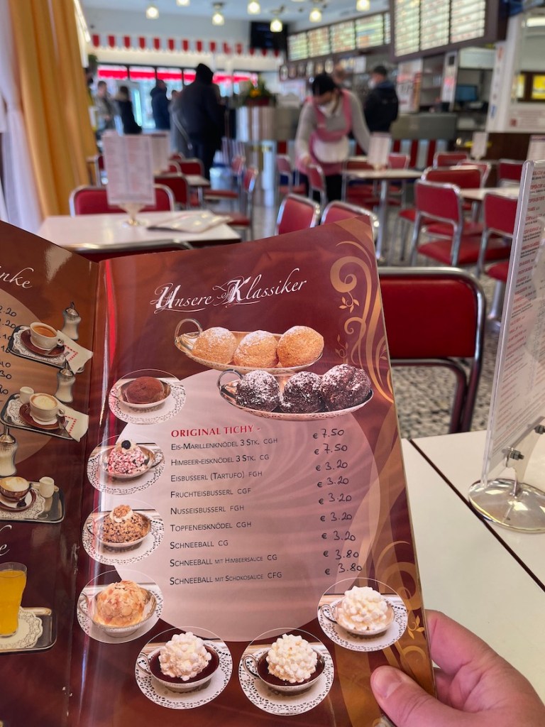 Wir sitzen tatsächlich im Tichy-Eissalon am Reumannplatz und bekommen die 4 Köstlichkeiten serviert: Eis-Marillenknödel, Himbeerknödel, Schneeball und Tartufo-Eisbusserl.