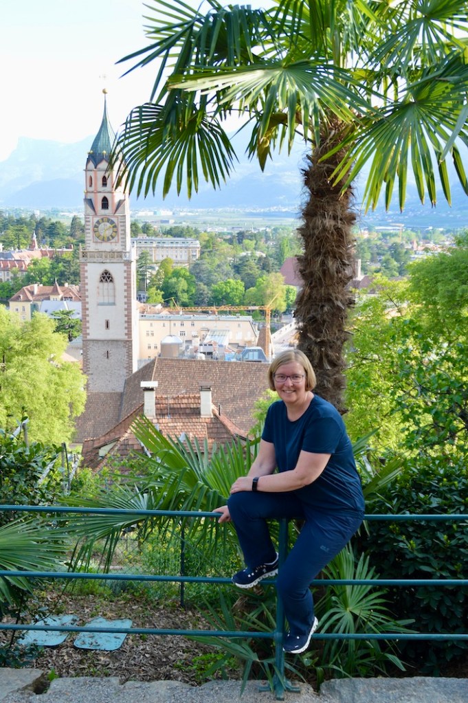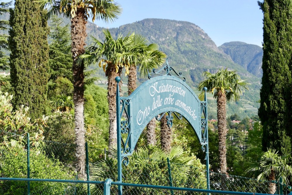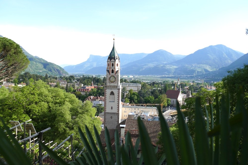 Für unsere Stadtrunde gehen wir jedoch in die andere Richtung. Wir folgen dem Weg oberhalb des Stadtzentrums noch weiter am Kräutergarten und am Kirchturm, dem meistfotografiertesten Meranblick, vorbei bis zum Zenoberg, wo der Tappeinerweg am Pulverturm endet.