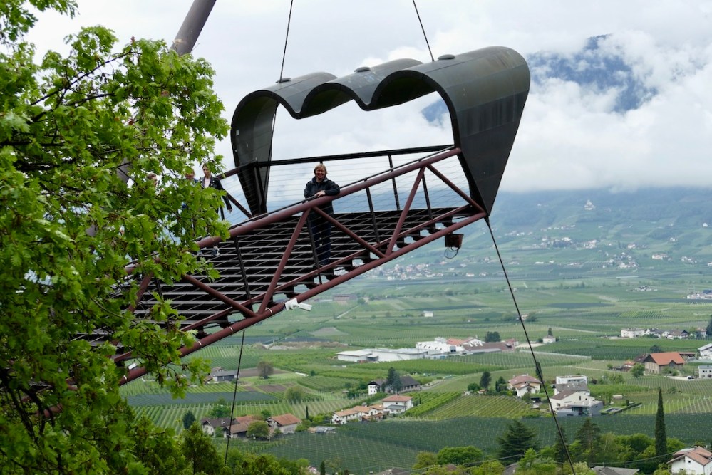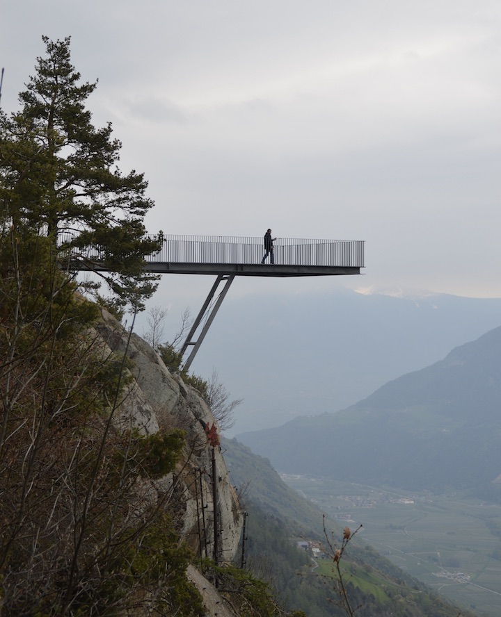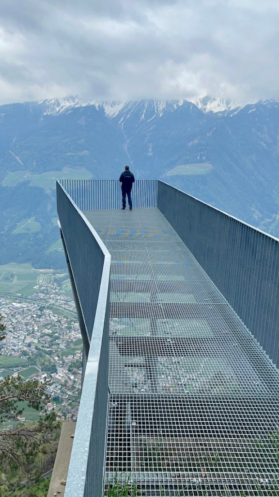 Die 16 Meter lange Plattform über Naturns ist nur was für Schwindelfreie, der Boden besteht aus Gitterrost, ist also durchsichtig.