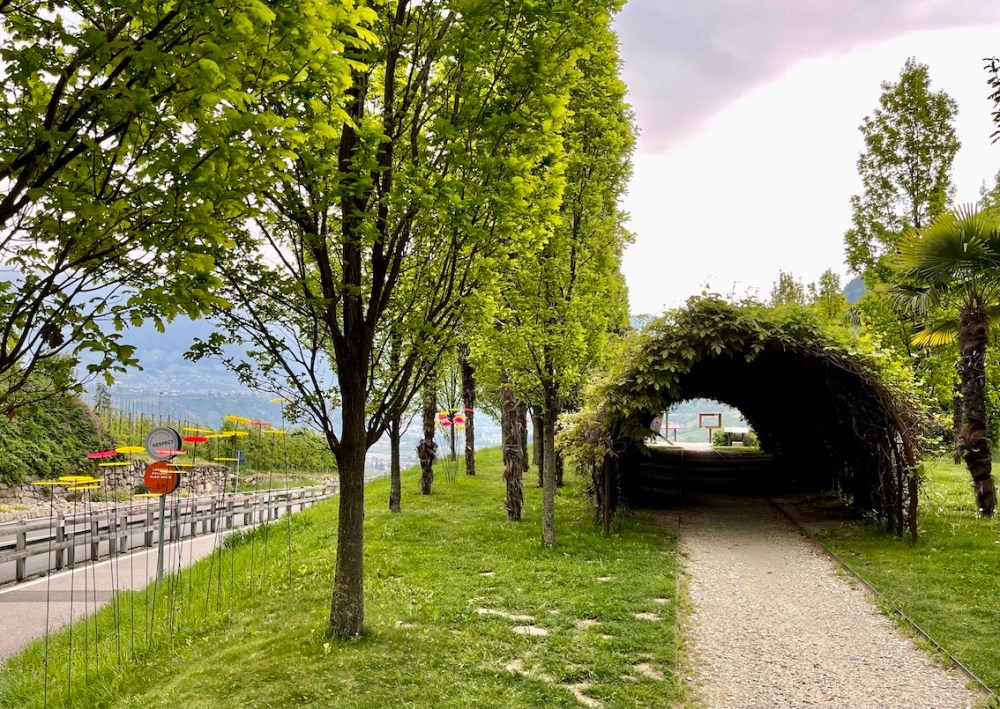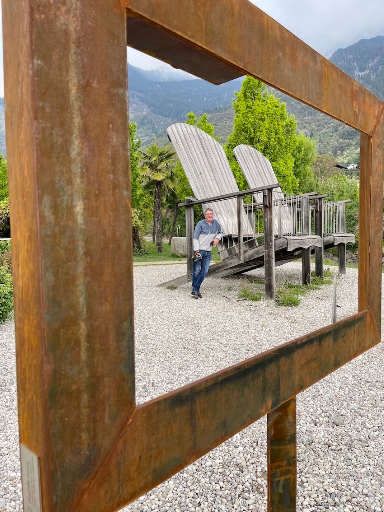 Macht aber unbedingt einen Abstecher zu den riesigen Holzstühlen. Vom Parkplatz sind es ca. 300 Meter zu der Aussichtsplattform am Radweg Via Claudia Augusta. Die Giganten wurden zum 10-jährigen Jubiläum der Gärten von Schloss Trauttmansdorff hier aufgestellt und sind seither ein beliebtes Fotomotiv am Einstieg des Algunder Waalweges.