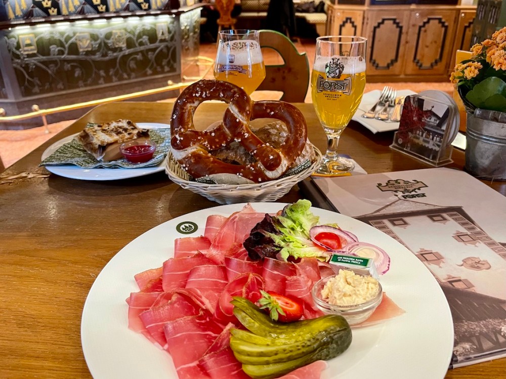 Der auffallende Gebäudekomplex ist unübersehbar wenn ihr auf der Vinschgauer Straße Richtung Meran unterwegs seid. Über die hölzerne Brücke gelangt man vom Parkplatz, eigenem Forst-Shop und Biergarten rüber zum Bräustüberl.