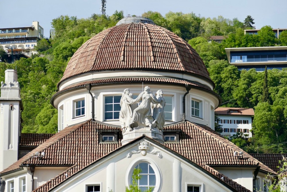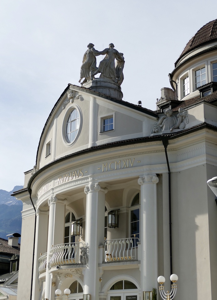 Das Kurhaus ist das Wahrzeichen von Meran und eins der schönsten Gebäude. Es steht immer noch für die Belle Époque. Ja, mit dem milden, mediterranen Klima und den Thermalquellen galt Meran als idealer Kurort. Gleich nebenan ist das Stadttheater.